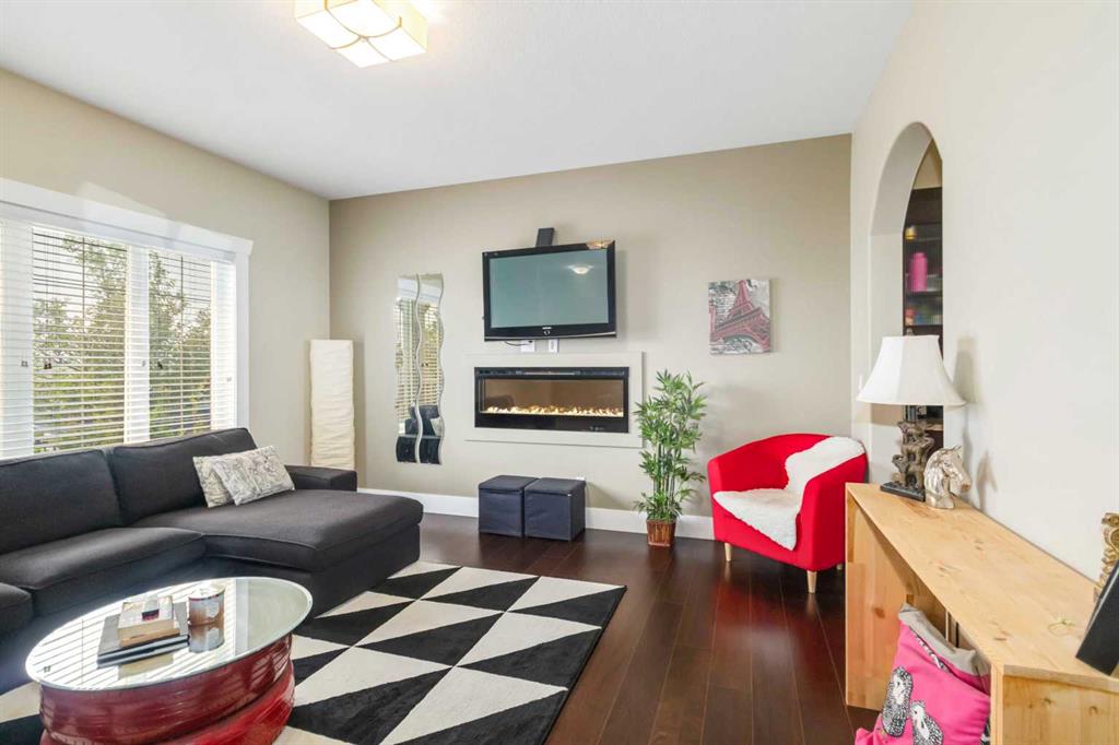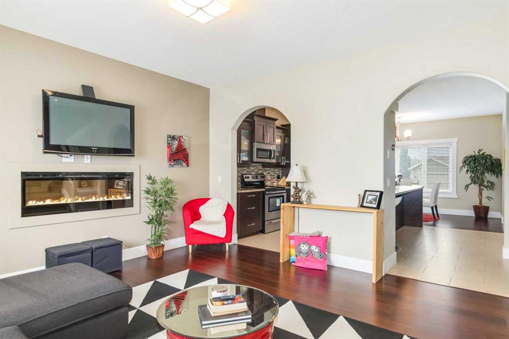 The main floor boasts gleaming dark hardwood floors, a cozy wall-mounted fireplace, and elegant archways that create just the right amount of separation between the spacious living room, dining area, and modern kitchen. The kitchen is designed for both function and style with sleek dark cabinetry, stainless steel appliances, an eat-up island, and a full pantry wall. A convenient 2-piece powder room is located near the back door, which leads to your fully fenced backyard, oversized heated single-car garage with a 10ft. door, and extra parking space.