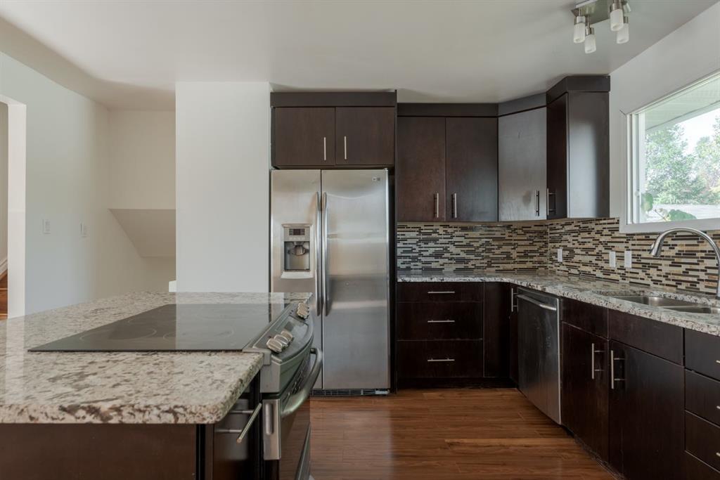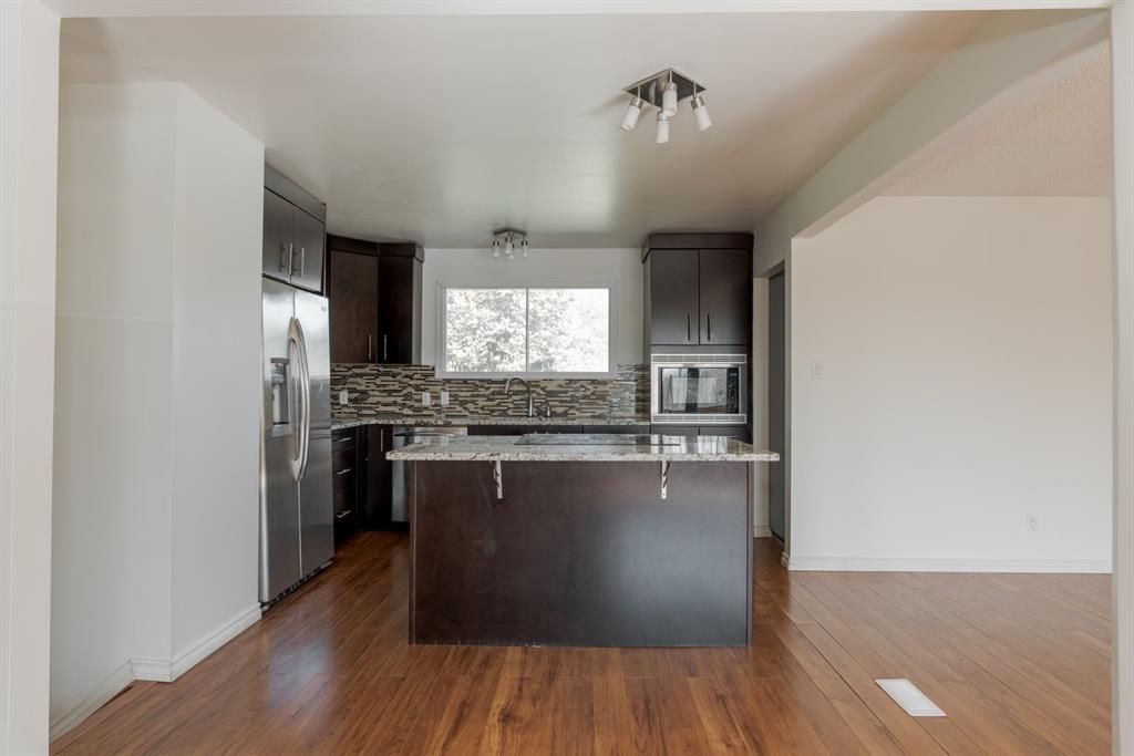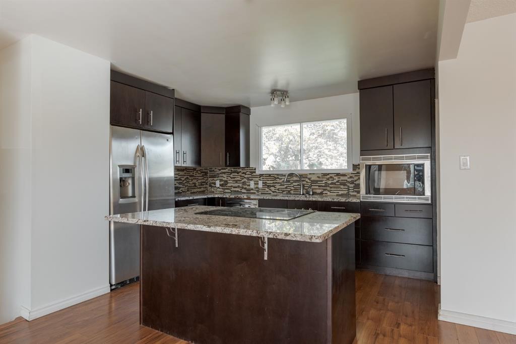 An open floor plan welcomes you inside where an updated kitchen with rich coloured cabinets, beautiful granite countertops, a large island, stainless steel appliances and a mosaic tile backsplash. Large windows bring in natural light and views and make the living room and dining room bright.