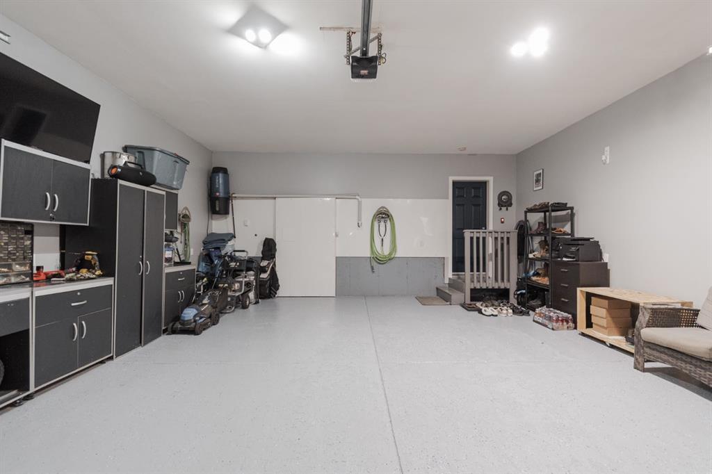 The curb appeal starts with an exposed aggregate driveway and attached 24x26 double car garage with 10 ft ceilings, epoxy floors, LED lighting, hot and cold taps, and plenty of included cabinetry — a dream set up for storage, hobbies or the perfect man cave.