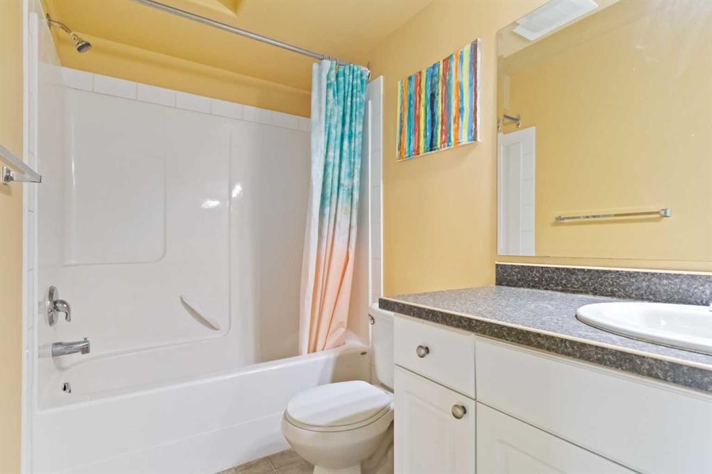 The primary bedroom includes a large closet and private ensuite with a full tub. Two additional bedrooms provide flexibility for guests, family, or a home office. A second full bathroom and in-suite laundry add to the comfort.