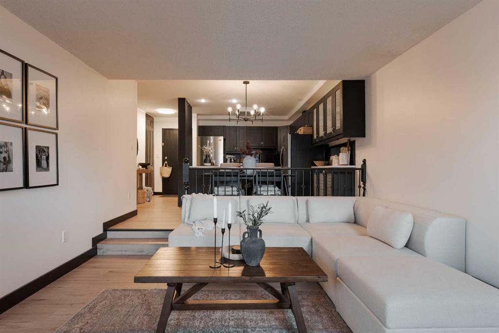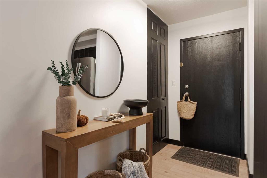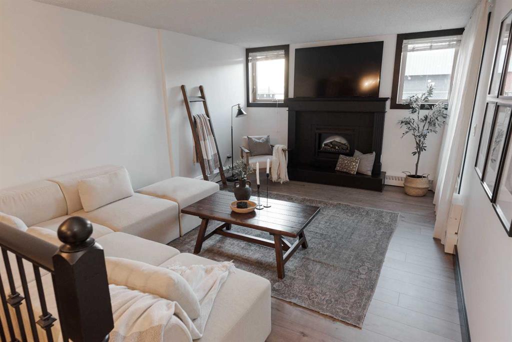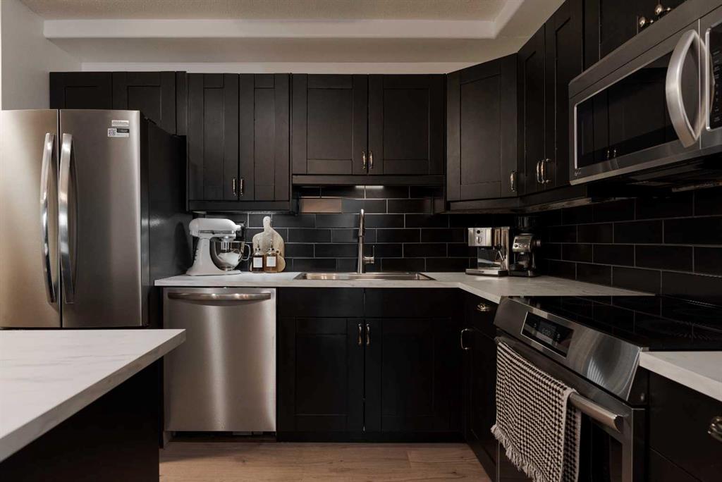 This chic, ground-floor residence effortlessly combines modern sophistication with everyday comfort. Offering a rare blend of space and style, it features 2 bedrooms, 2 bathrooms, a walk-in closet, and a full laundry room - all transformed with timeless design and thoughtful updates. Inside, every detail reflects a designer’s touch - from the matte black cabinetry and warm brass accents to the fresh paint, wide-plank LVP flooring, and new stainless appliances. The kitchen shines with a large peninsula, sleek black subway tile backsplash, farmhouse sink, an induction stove, and dual fridges (or a fridge and stand-up freezer) - balancing form and function beautifully. The open dining area overlooks a sunken living room anchored by an electric fireplace (AS IS) and framed by windows that fill the space with natural light. Step out to the covered, ground-floor balcony - perfect for morning coffee, pets, or simply relaxing outdoors - complete with a private storage area.