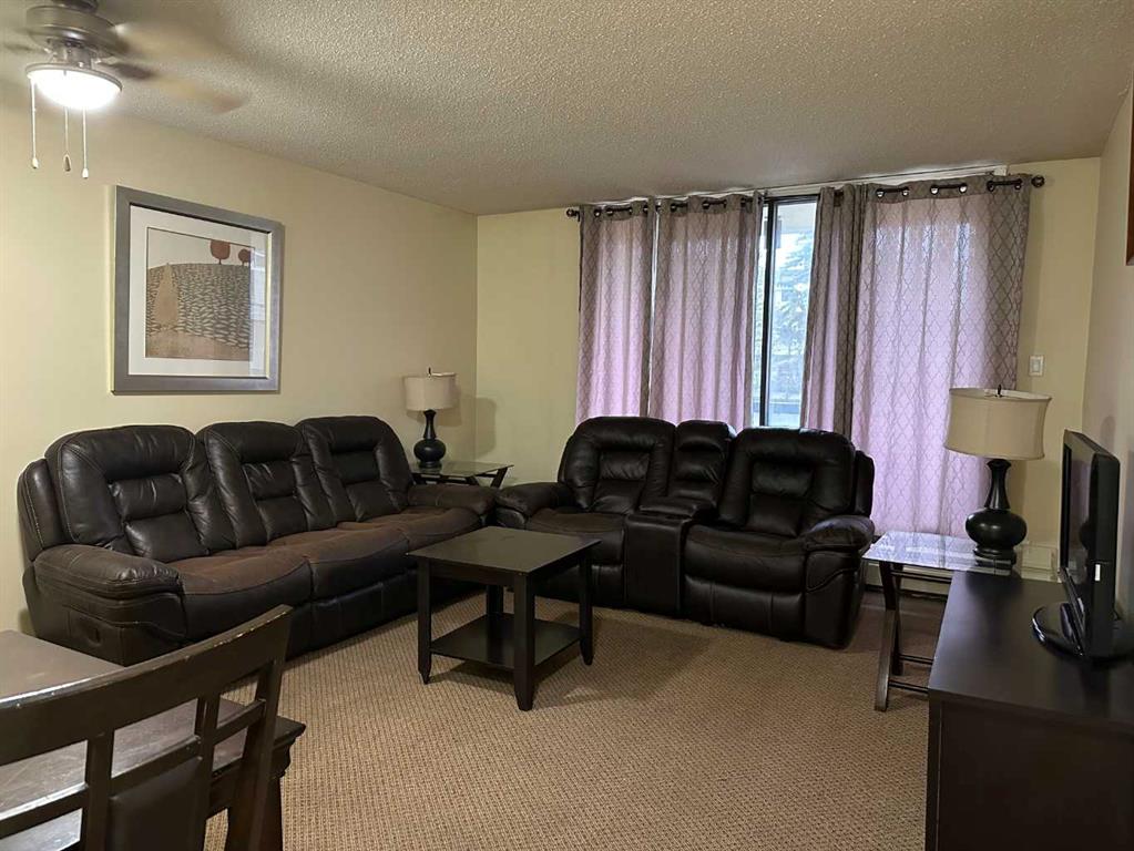 Step into a bright and functional kitchen featuring plenty of newer cabinets, storage, durable countertops, and classic white appliances. The adjoining living area offers a cozy space to relax, with large windows that fill the room with natural light. Neutral tones and comfortable furnishings make it easy to envision your own personal touches. The spacious bedroom provides ample room for a queen bed, complete with matching furniture and a warm, inviting atmosphere. The full bathroom and in-suite storage add convenience and practicality. Enjoy the comfort of carpeted flooring throughout the main living areas, with durable lino in the kitchen, entrance, storage and bathroom for easy maintenance. Located in a well-managed building, this condo is close to shopping, dining, parks, and public transit — offering both comfort and convenience. Whether you’re looking for a move-in-ready home or a solid rental investment, this condo checks all the boxes!