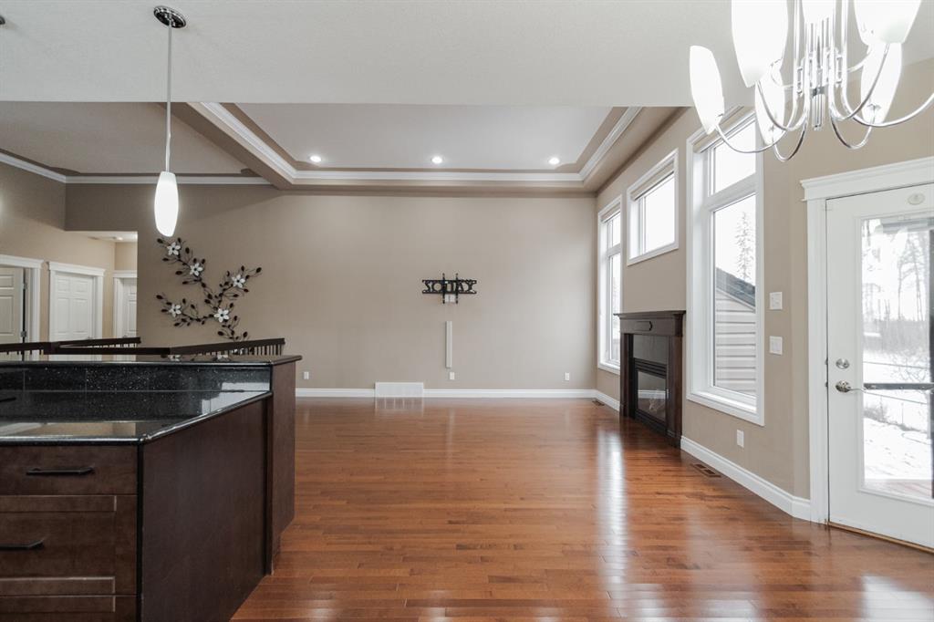 Inside, the main level begins with a dedicated office at the front of the home with floor to ceiling windows overlooking the covered front step. Beyond this is a warm open living space centred around a gas fireplace, high ceilings, stacked windows, and beautiful views of the yard and tree line behind it. The kitchen offers granite counters, a large island, cabinets that extend to the ceiling, a built in wall oven and microwave, a gas cooktop installed in 2020, a dishwasher from 2020, and a fridge from 2019. The sellers upgraded the cupboards and handles in 2020, giving the space a fresh, modern, and timeless look. Hunter Douglas blinds add a clean and finished feel throughout.