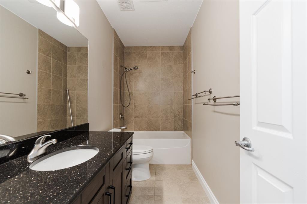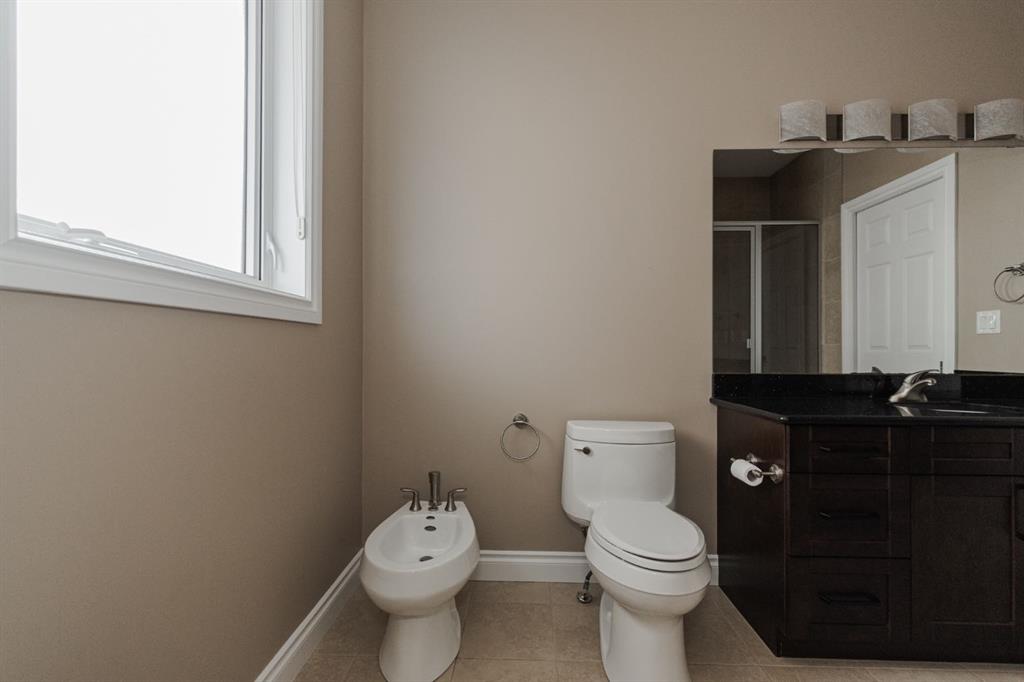 The main level is complete with two bedrooms, including a perfectly sized guest or children’s room. The primary bedroom features a walk in closet with custom built ins, a linen closet, and a five piece ensuite with a jetted tub, granite counters, tile floors, and a bidet. The second full bathroom is conveniently located next to the second bedroom.