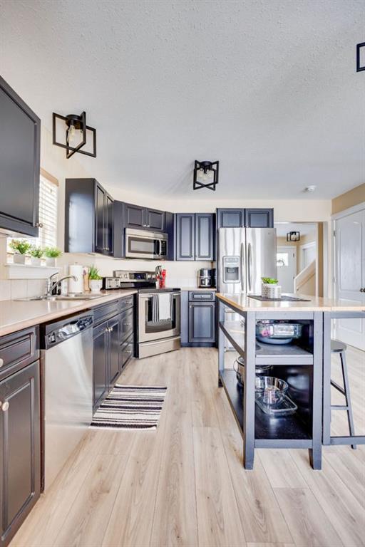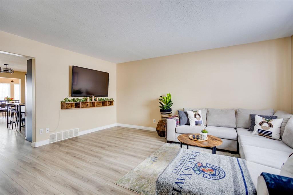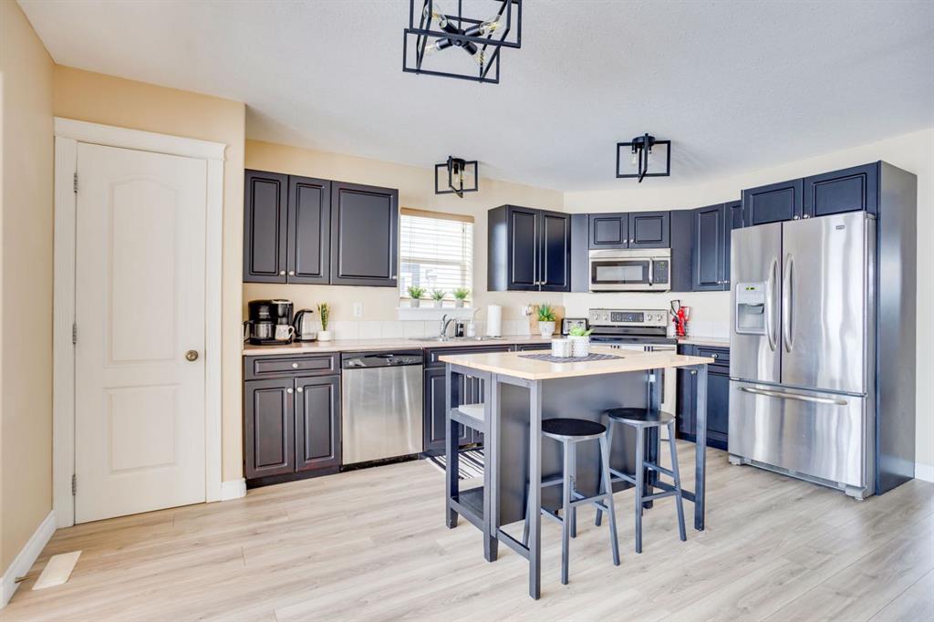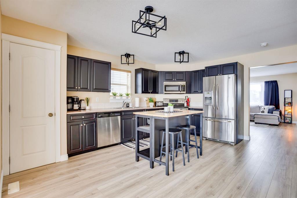 The main floor features a bright, open-concept layout enhanced by large windows, new lighting fixtures, and brand-new vinyl plank flooring throughout. A convenient 2-piece bathroom adds functionality, while the kitchen impresses with all-new appliances, dark cabinetry, and generous counter space—perfect for both everyday living and entertaining.