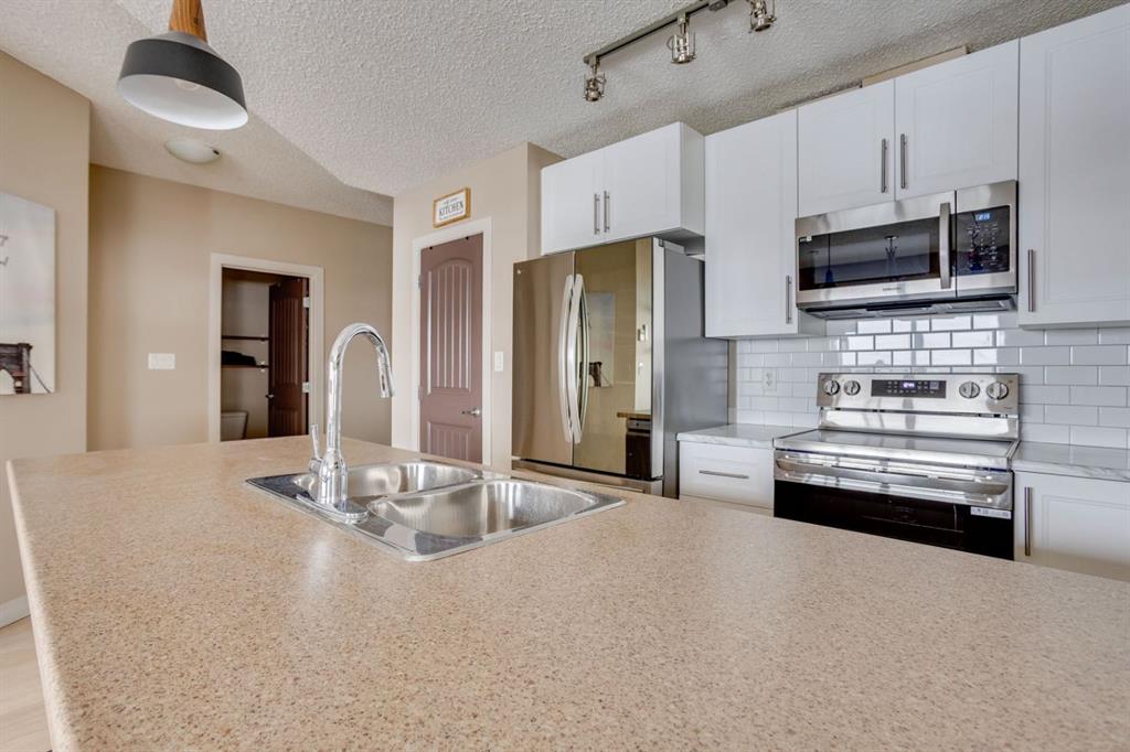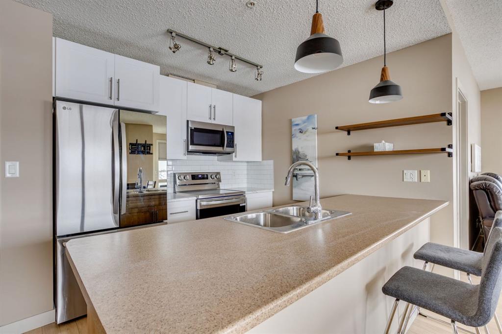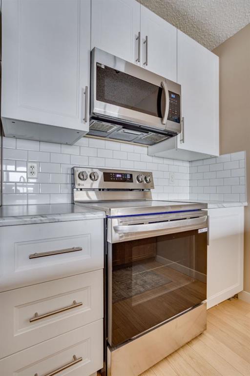 The bright, modern kitchen features laminate flooring, white upper cabinetry, a convenient eat-up breakfast bar, and ample cabinet and counter space. Recent upgrades include a new stainless steel refrigerator, stove, microwave, washer, and dryer, along with a newly installed white subway tile backsplash.