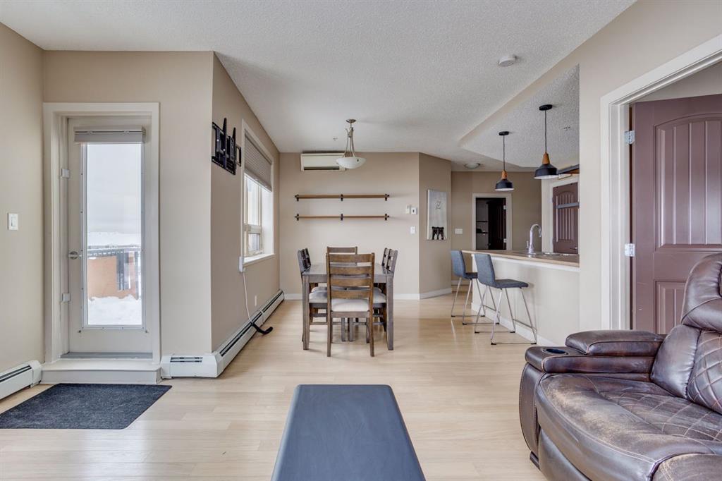 The main living area is highlighted by laminate flooring, central air conditioning, and abundant natural light, with direct access to the second covered exterior balcony—ideal for relaxing or entertaining.
