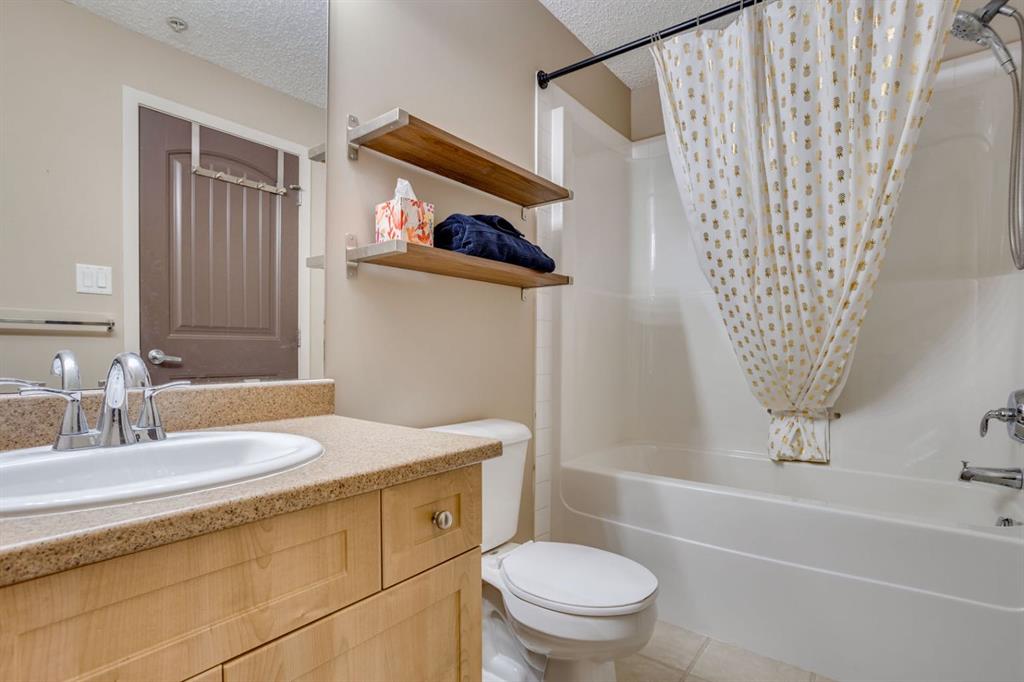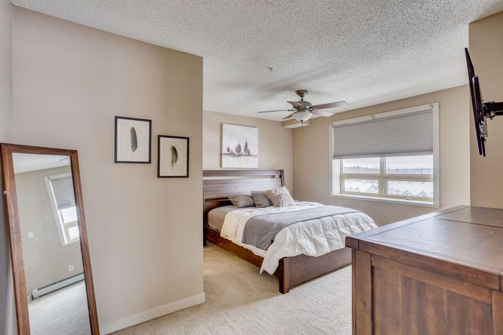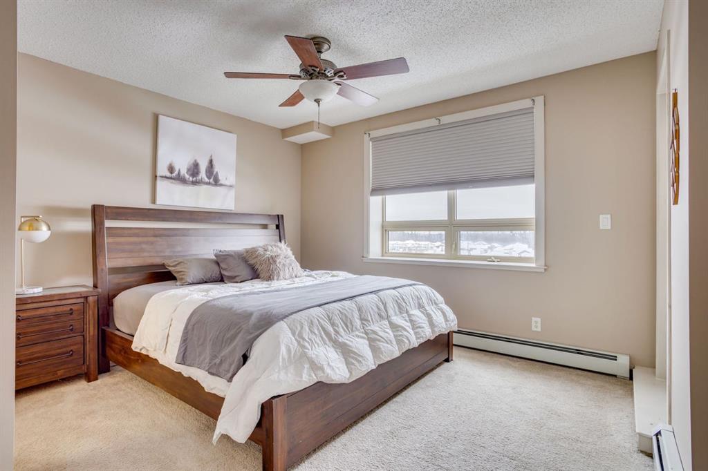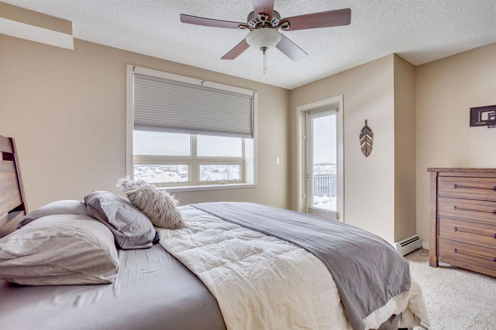 Both bedrooms are generously sized and offer plush carpet flooring and large windows. The primary suite includes a walk-through closet, a 4-piece ensuite bathroom with a tub/shower combination, and private access to one of the exterior balconies. The secondary bedroom is conveniently located near an additional 4-piece bathroom.