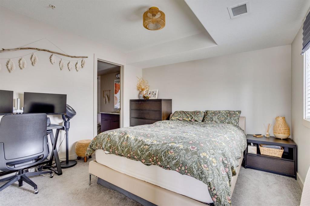 Both bedrooms are generously sized and offer plush carpet flooring and large windows that allow for abundant natural light. The primary suite includes a walk-through closet and a four-piece ensuite bathroom with a tub/shower combination. The secondary bedroom is directly connected to an additional three-piece bathroom, which also features a secondary entrance from the main living area—providing added convenience for guests or family.