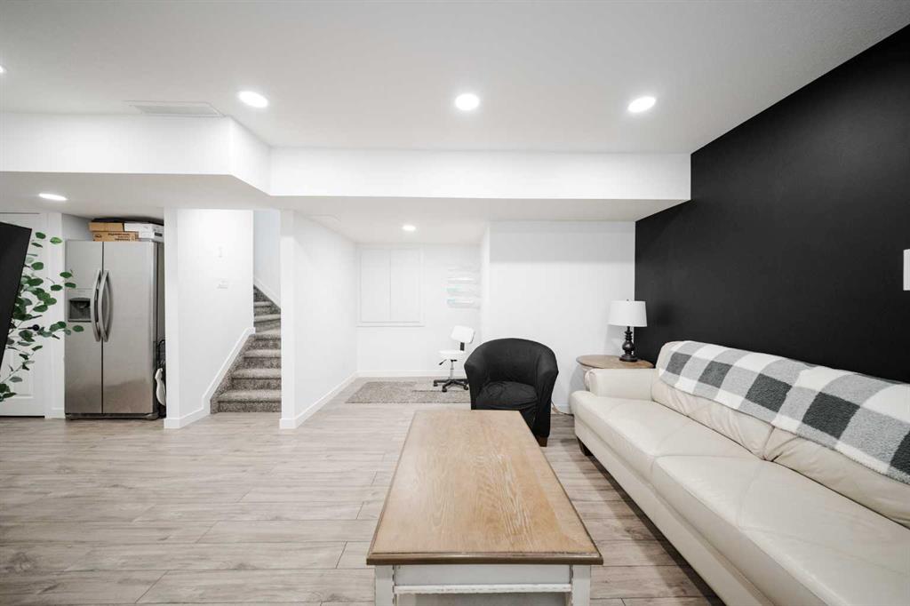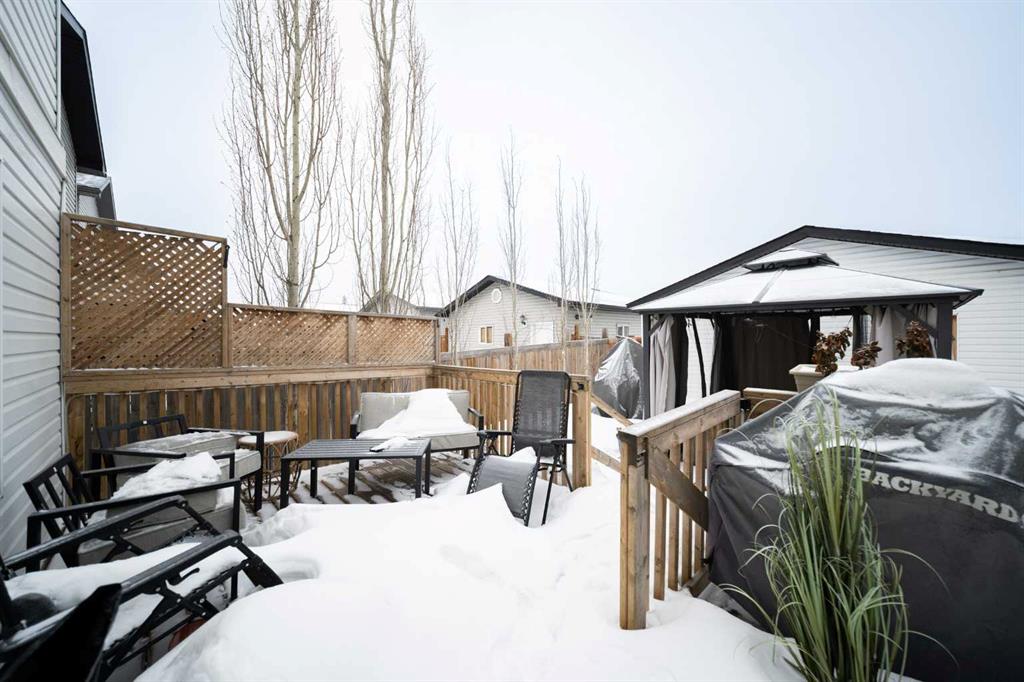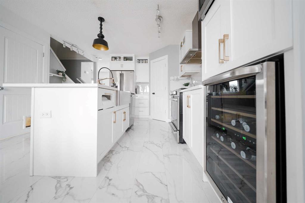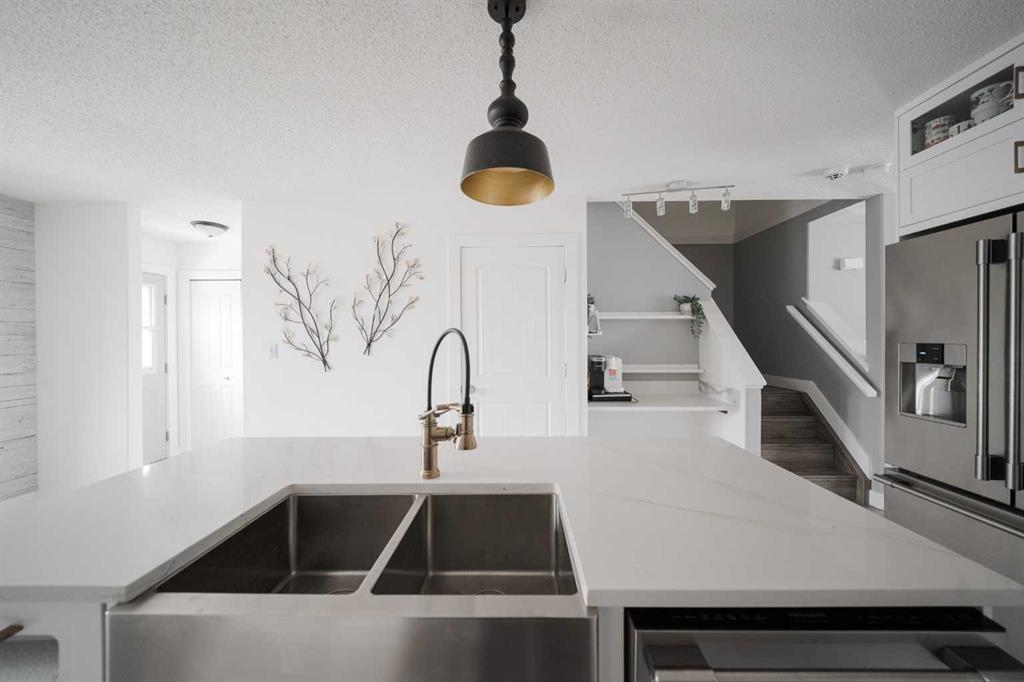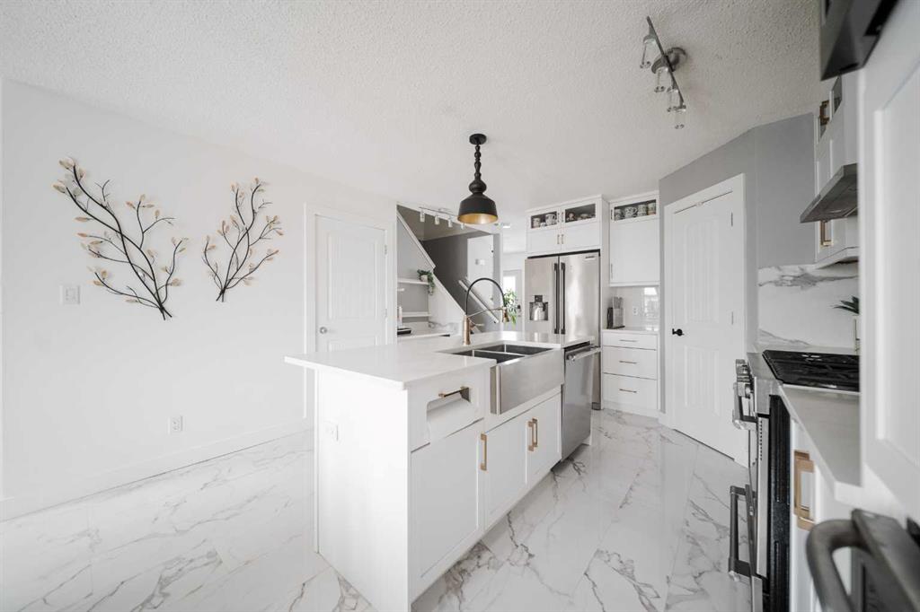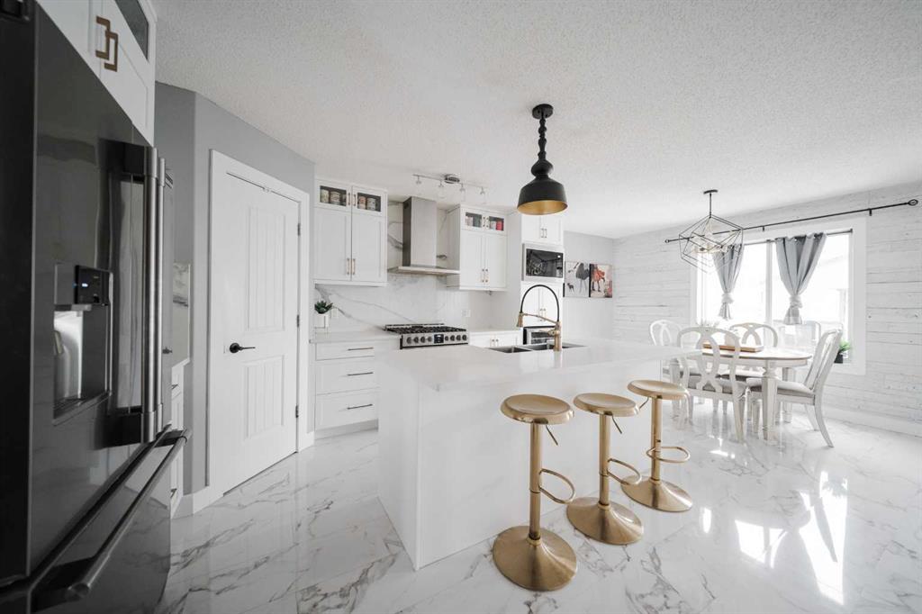 Welcome to 237 Sandstone Lane, where exceptional craftsmanship, thoughtful upgrades, and timeless design come together in one stunning Stone Creek home. Major exterior improvements include updated shingles, exterior doors, a newer deck, and a dedicated hot tub pad with wiring completed (permit approved). Step inside to a spacious front living room featuring modern laminate flooring and a striking feature wall, flowing seamlessly into a show-stopping white kitchen by Jos-Will Millwork. Built with solid maple doors, elegant gold hardware, under-cabinet lighting, glass-front uppers, and a massive 8-foot island topped with seamless quartz countertops, this chef’s kitchen is both beautiful and built to last. Upgraded Frigidaire Professional Series appliances (including a gas stove), luxury vinyl plank flooring, contemporary lighting, a coffee bar, and a built-in wine cooler complete the space. The main level also offers a stylish updated 2-piece bathroom and a spacious dining area accented by a chandelier overlooking the backyard. Upstairs you’ll find new trim, new closet doors, three bedrooms, and two fully renovated bathrooms — all finished with matching cabinetry, quartz countertops, new toilets, mirrors, and luxury vinyl plank flooring for a cohesive high-end feel. The newly completed basement features a professionally finished California knockdown ceiling, cozy family room, spacious bedroom, full bathroom, and beautiful laminate flooring — perfect for guests or growing families. Outside, enjoy the private backyard oasis with a deck (2021) with privacy lattice, full fencing, tasteful landscaping with Aspen trees, interlocking brick, flower beds, an enclosed dog run with artificial turf, and a detached double garage (2022) with rear alley access. Additional highlights include central A/C and a prime location close to schools, shopping, and all Stone Creek amenities. Move-in ready luxury — this home truly checks every box!