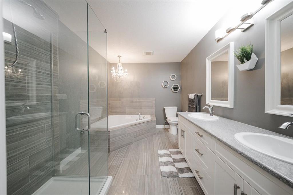 Upstairs, the home offers three bedrooms and two full bathrooms, along with a small bonus living space that works well as a play area, reading nook, or home office. The primary suite is a standout, featuring a walk through walk in closet leading to the ensuite, complete with a soaker tub accented by a chandelier and a separate walk in shower. A convenient two piece bathroom is located on the main floor.