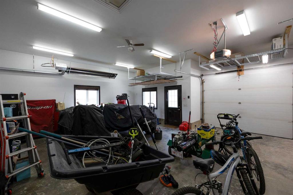 garage door opener and 2 remotes, garage heater, 2 storage racks in garage (above garage door and window), all