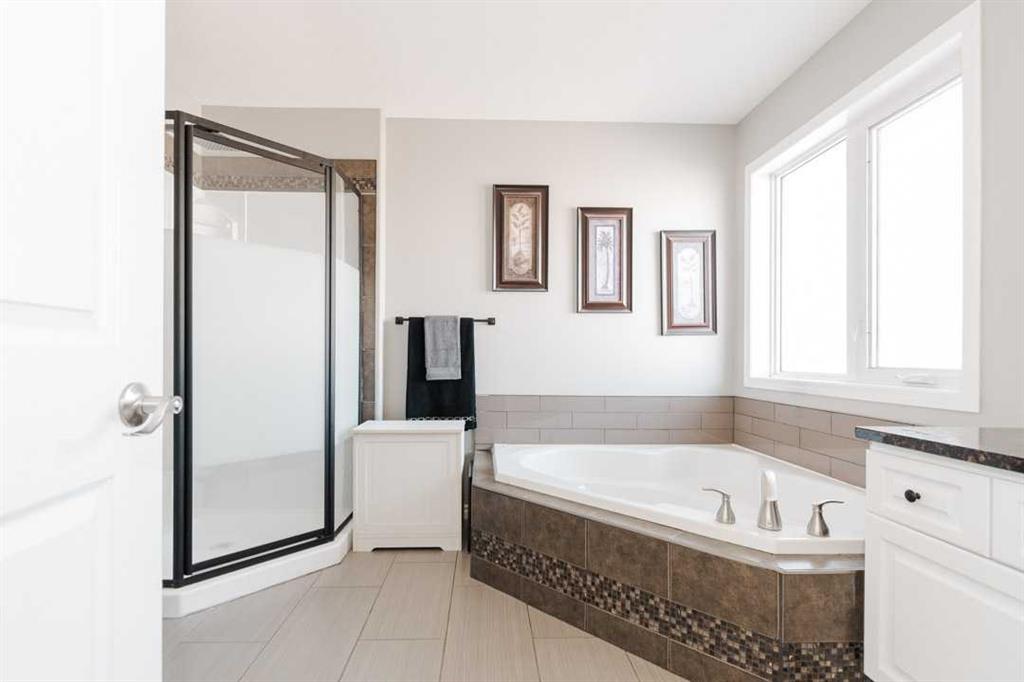 The primary suite feels like a private retreat: a large walk-in closet with custom built-ins for effortless organization, and an ensuite bath featuring a relaxing corner jetted tub, updated fixtures, and a roomy walk-in shower. Two additional spacious bedrooms round out the upper level. Downstairs, the fully finished basement adds 1,060 sq ft of versatile living with 9-foot ceilings and thoughtful soundproofing insulation in the walls and ceiling. You’ll also find another inviting family room with a gas fireplace great for the kids. Bedroom great for night shift workers Another open room perfect for playspace, gym or pool table. Also A practical 3-piece bath w/Generous storage throughout the whole basement.