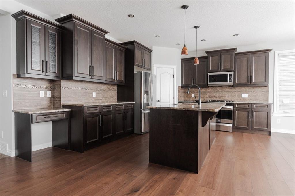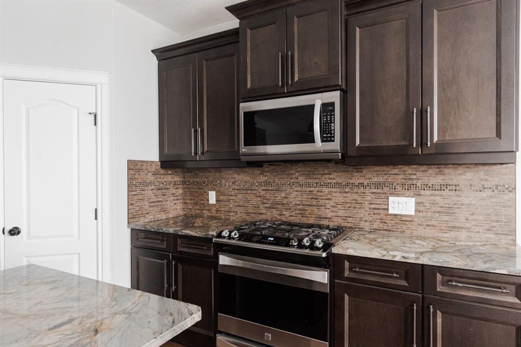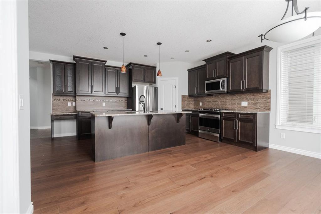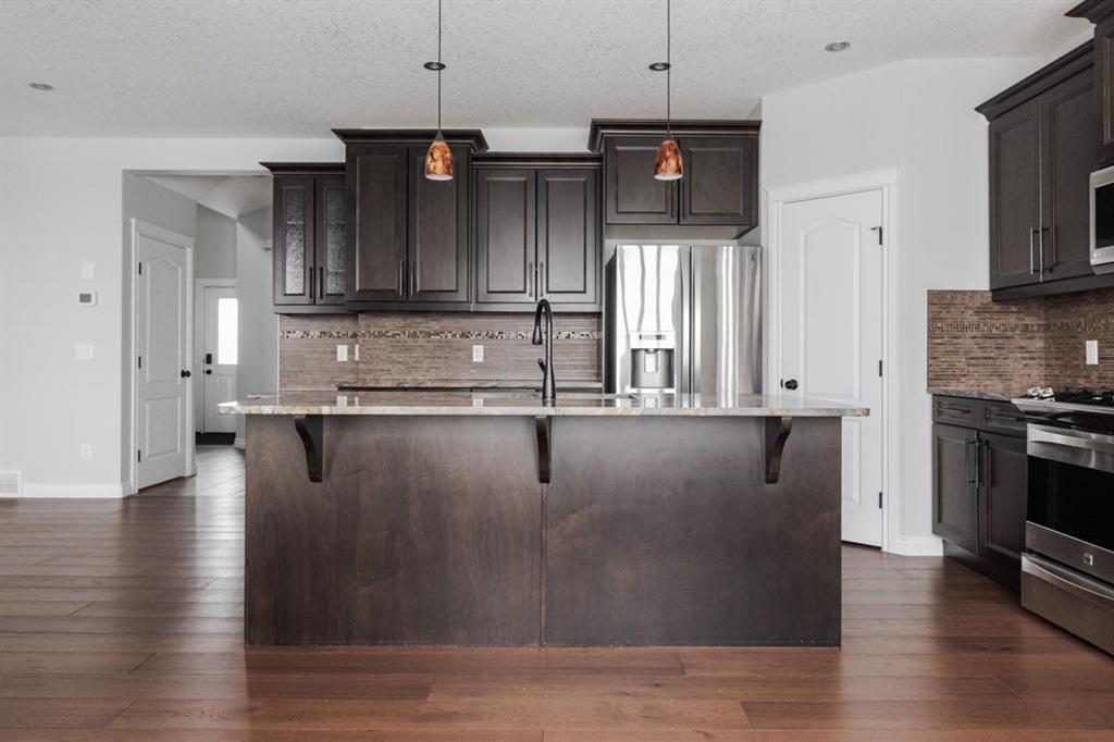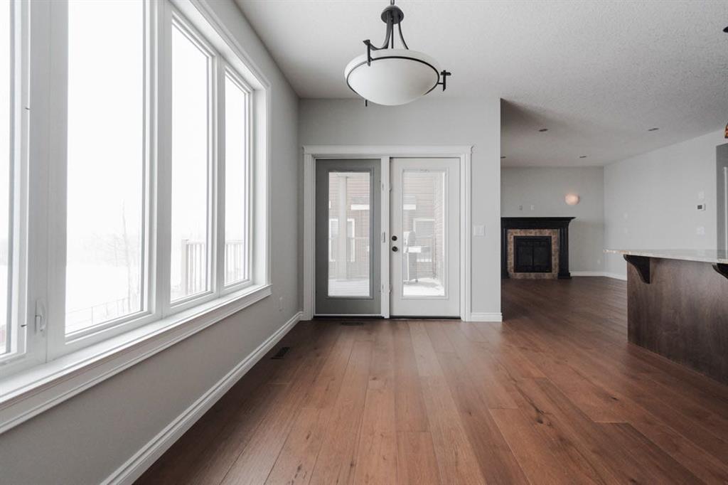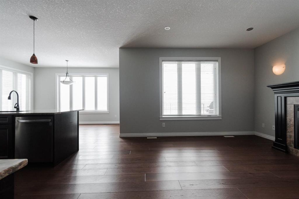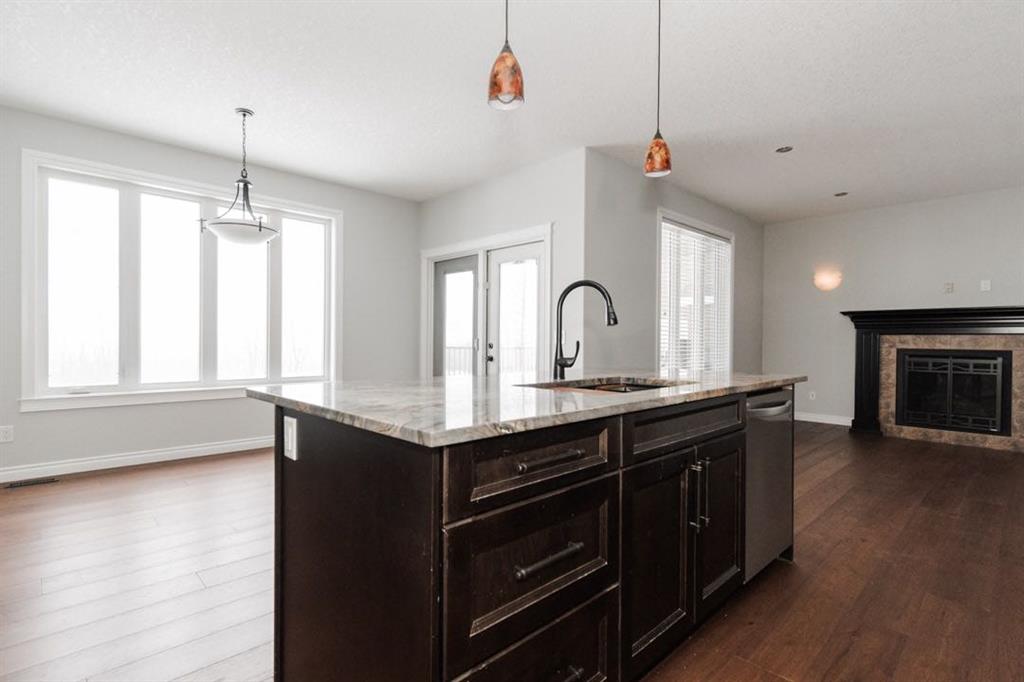 Inside, the main level features an open concept layout designed for modern living. The kitchen is finished with granite countertops, stainless steel appliances (microwave replaced in 2022), and a convenient walk through pantry. The living room is centred around a gas fireplace, creating a warm and inviting focal point. A two piece bathroom and main floor laundry with upper cabinetry add everyday convenience. The entire home was painted in 2020, giving it a fresh and cohesive feel.