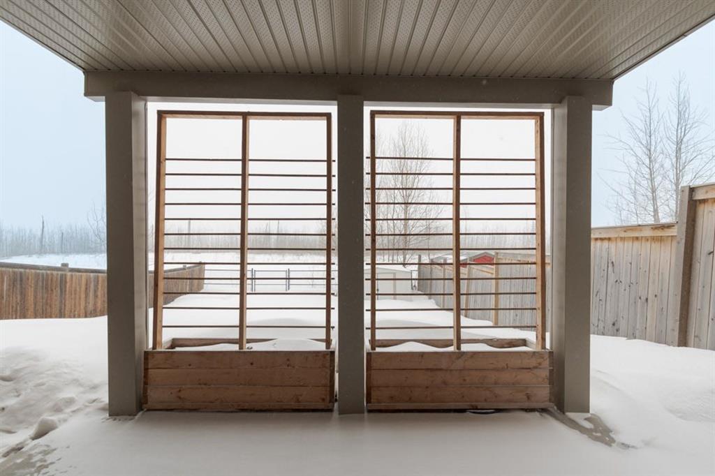 The backyard backs directly onto green space and features raised garden boxes, a shed that will remain, and a wide gate that was replaced following the fire. The upper deck is finished with durable Dura Deck and includes a gas line for barbecuing. Grading has been done to direct water away from the home.