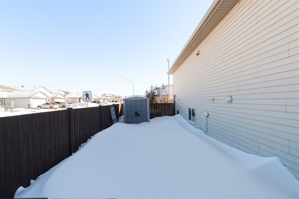 The exterior offers rear alley access with parking for four vehicles on the gravel pad, RV parking capability, and a fully fenced side yard. A garden shed is also included.
