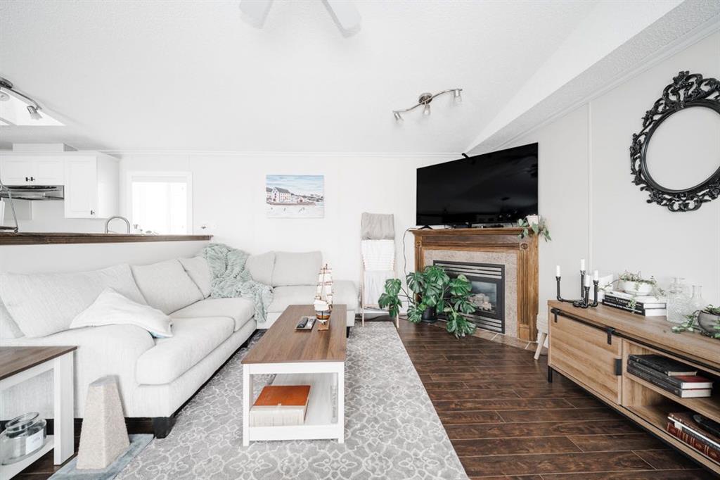 The living room is bright and inviting, featuring a cozy gas fireplace and an open layout that flows seamlessly into the kitchen and dining area, ideal for both everyday living and entertaining.