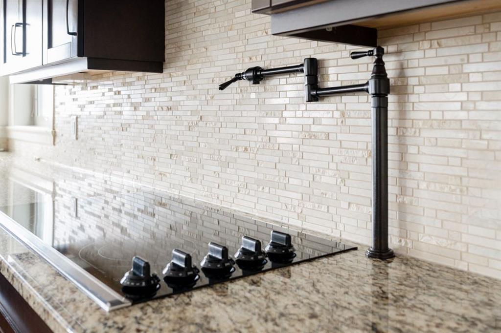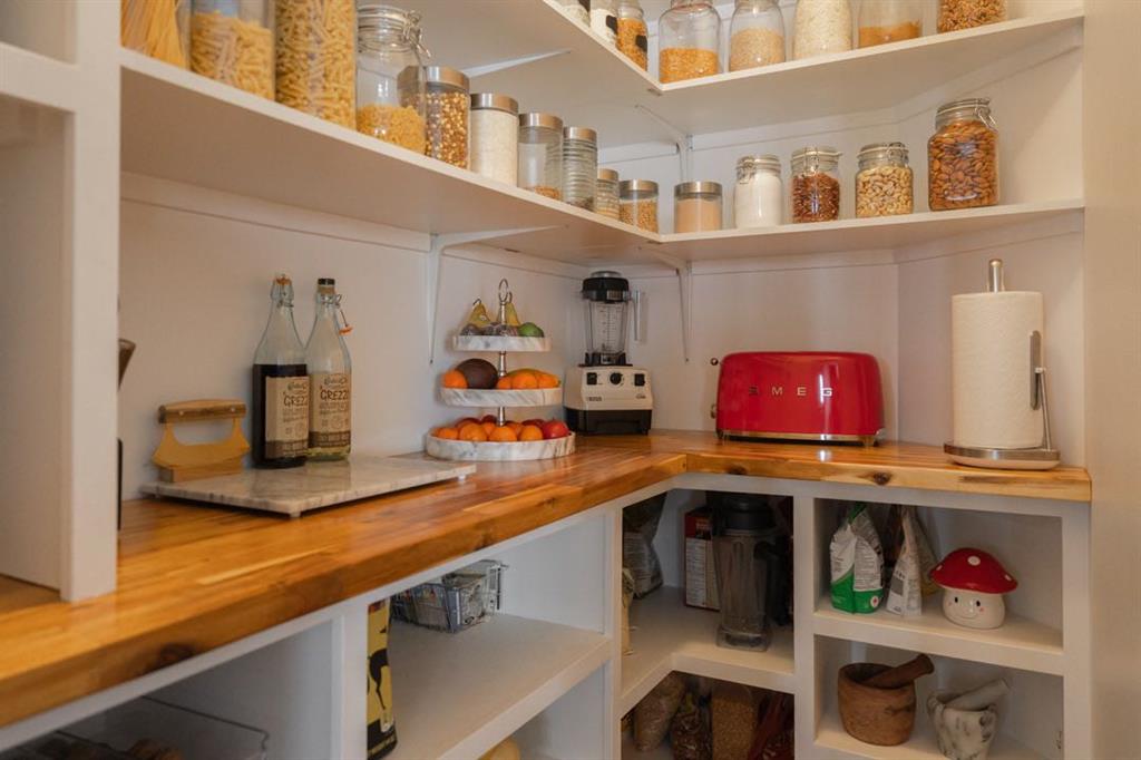 The kitchen was designed with both beauty and function in mind, featuring granite countertops, ceiling height cabinetry with crown mouldings, mosaic tile backsplash, under cabinet lighting, a pot filler, and built in appliances. The pantry has been thoughtfully upgraded with butcher block counters and custom built ins, creating the perfect butler style pantry for entertaining and storage. Just off the dining nook you’ll find access to the DuraDeck upper deck with natural gas line for your BBQ where you can enjoy quiet mornings overlooking the trees.