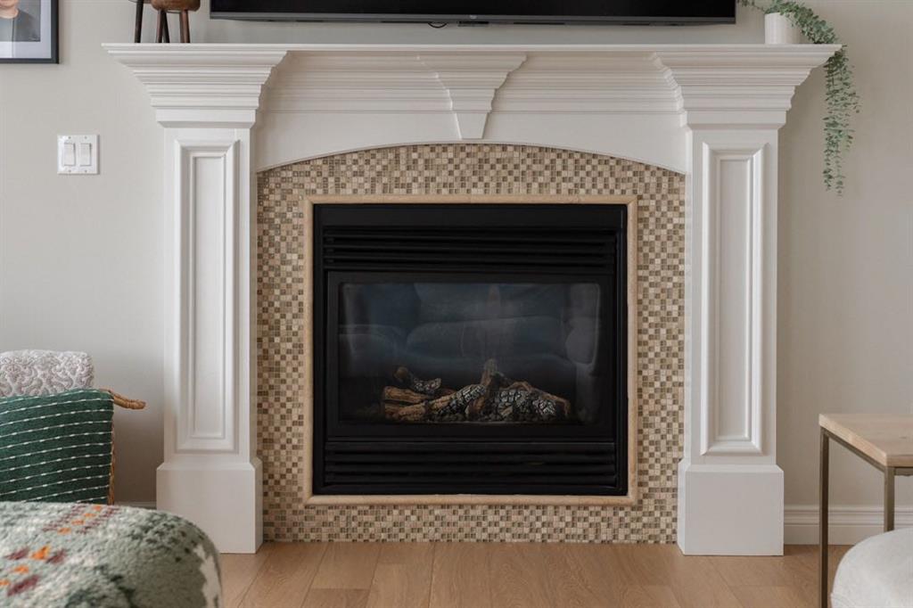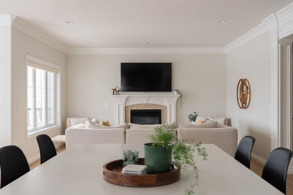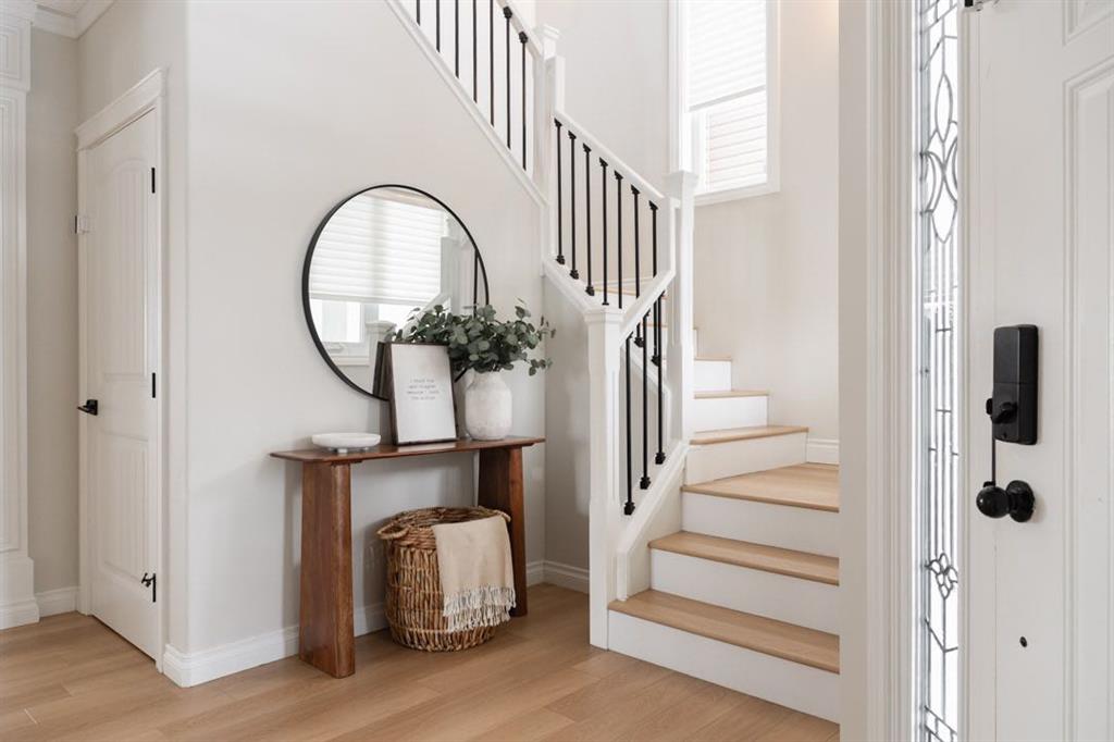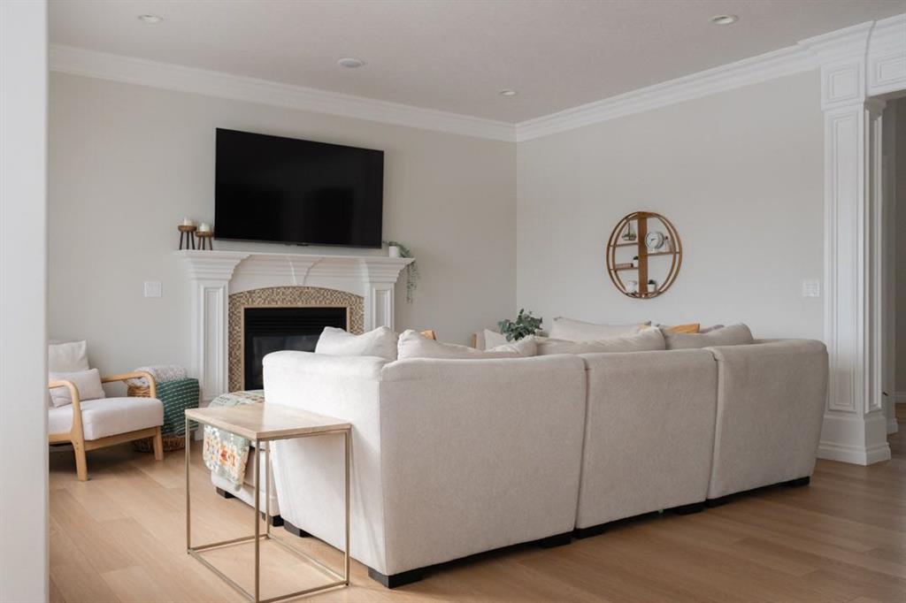 The main level immediately feels open and inviting with views up to the second floor, a gorgeous chandelier hanging overhead, and a bright, spacious entry that sets the tone for the rest of the home. Updated luxury vinyl plank flooring installed in 2023 runs throughout the main level, complemented by fresh paint that creates a clean, timeless aesthetic. The living room is warm and comfortable, centred around a gas fireplace and surrounded by windows that bring the outdoors in.