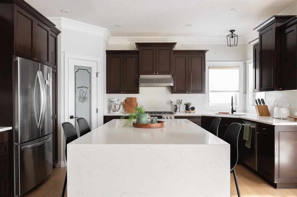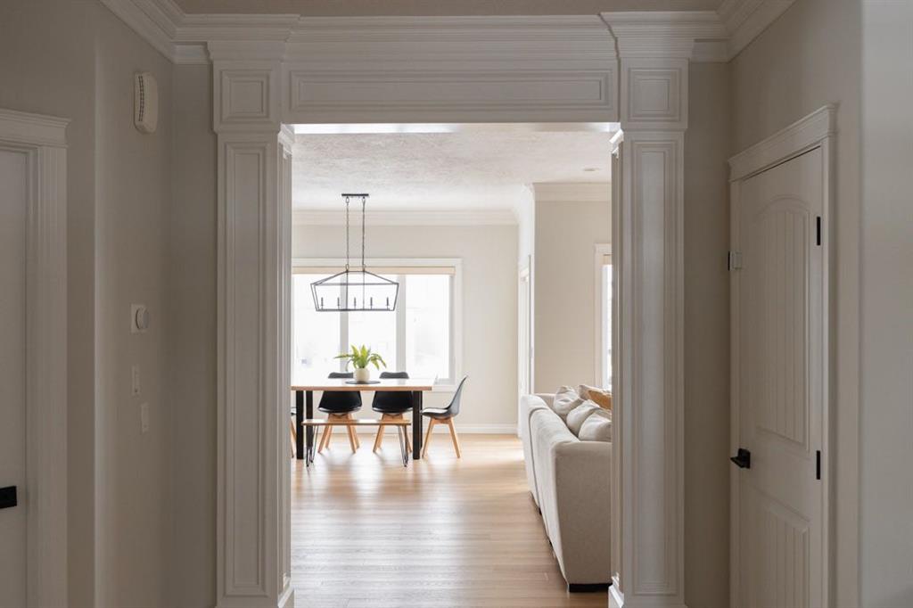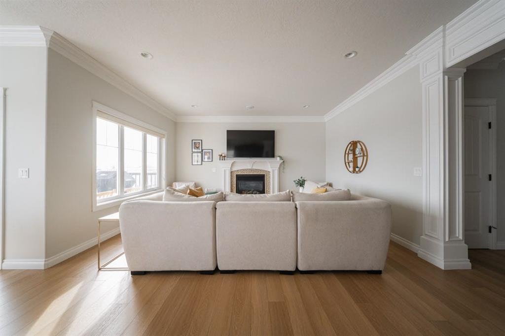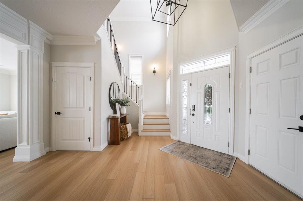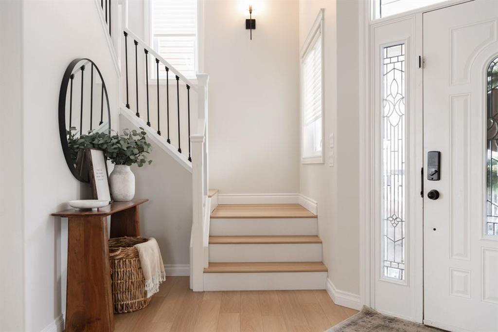 The main level immediately feels open and inviting with views up to the second floor, a gorgeous chandelier hanging overhead, and a bright, spacious entry that sets the tone for the rest of the home. Updated luxury vinyl plank flooring installed in 2023 runs throughout the main level, complemented by fresh paint that creates a clean, timeless aesthetic. The living room is warm and comfortable, centred around a gas fireplace and surrounded by windows that bring the outdoors in.