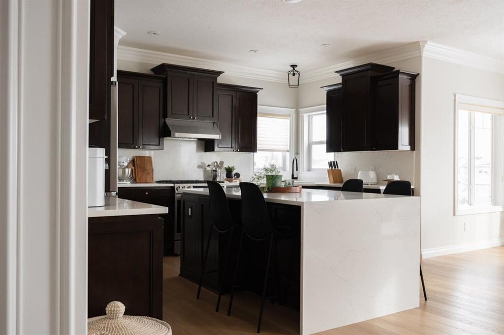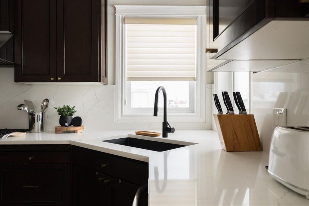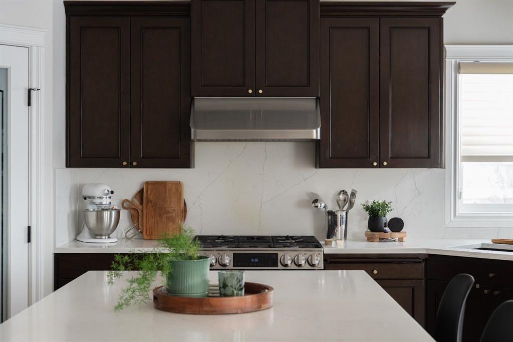 The kitchen has been thoughtfully updated and designed for both beauty and function. Quartz countertops installed in 2023 feature a stunning waterfall edge island and slab backsplash, creating a sleek and contemporary focal point. Stainless steel appliances, including a gas range installed when the owners moved in, complete the space. The dining area features a new chandelier that complements the entry lighting and overlooks the backyard, with direct access to the deck where a gas line is ready for your BBQ, making summer entertaining effortless.