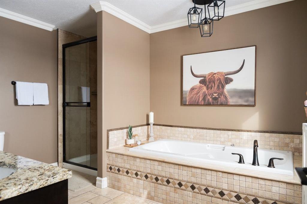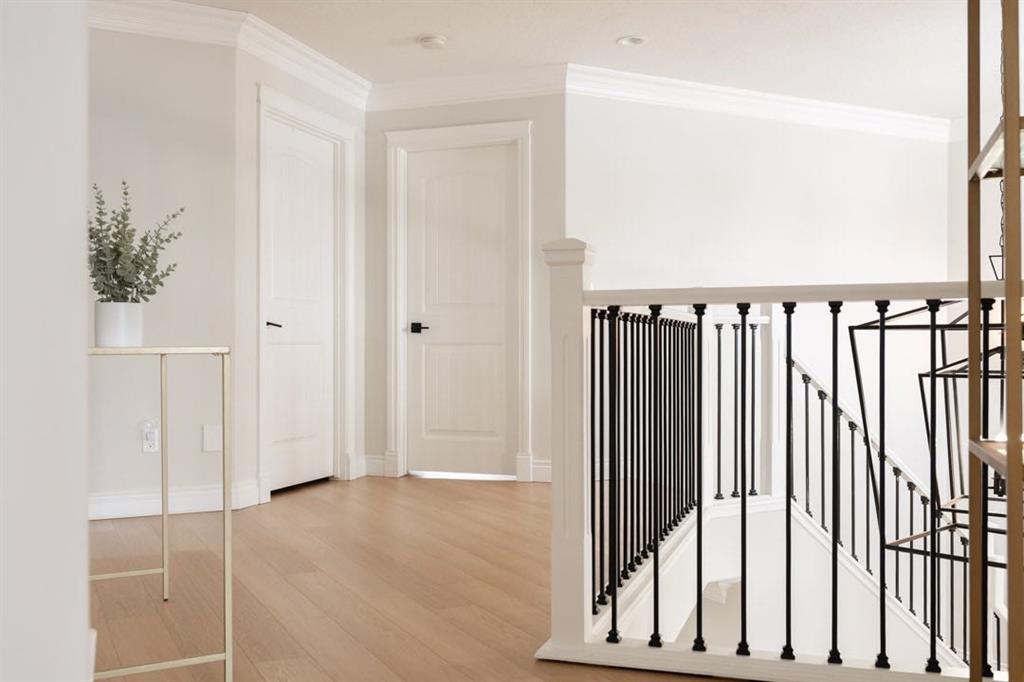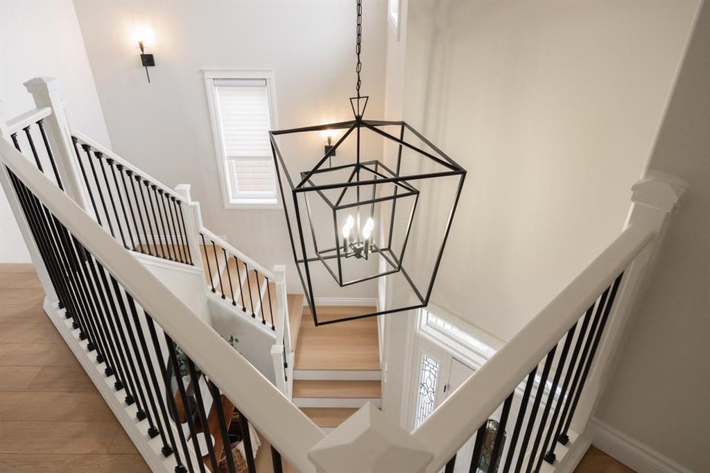 Upstairs, the layout is ideal for families with a rare four bedroom configuration. The primary bedroom is positioned privately at the top of the stairs and features a spacious ensuite and walk in closet. The three additional bedrooms are tucked at the end of the hallway, creating a quiet wing for children or guests. The upper level also features an open hallway overlooking the entry below, updated banister details, modern wall sconces along the staircase, and the convenience of an upstairs laundry room. The upstairs bathroom was refreshed with white subway tile in 2023.