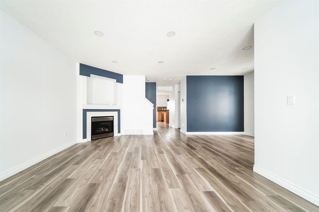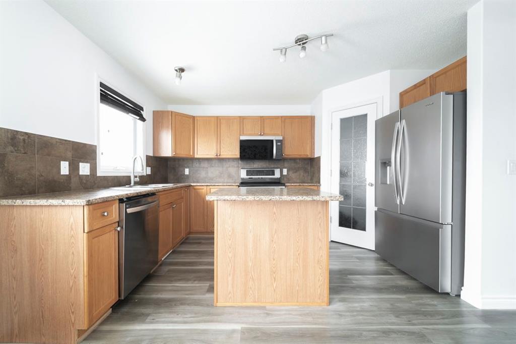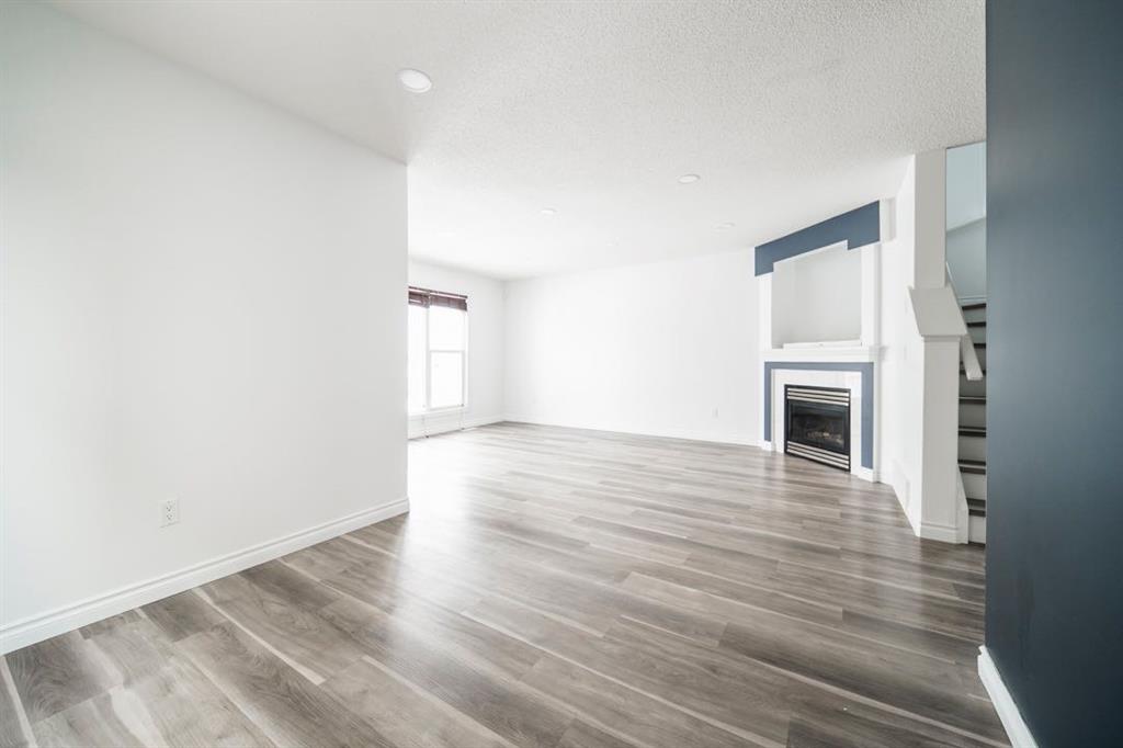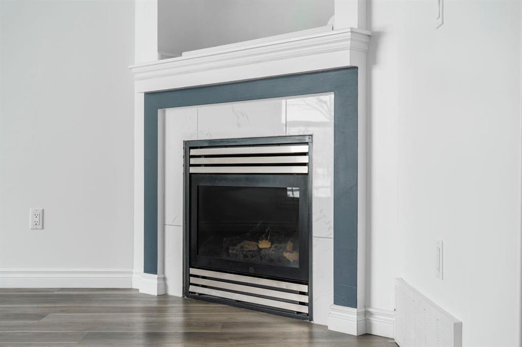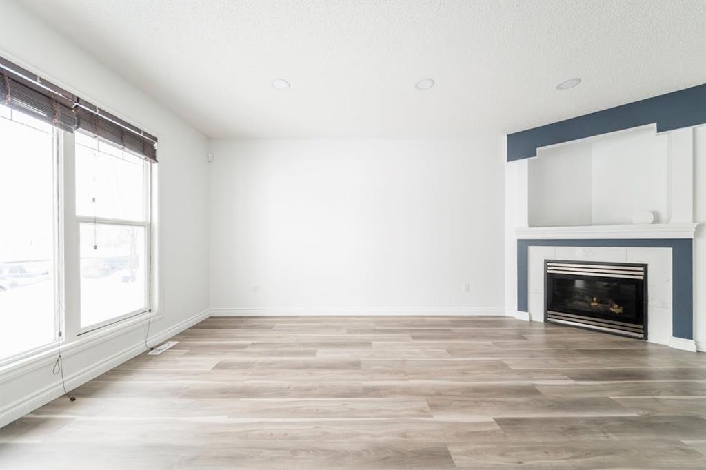 The home welcomes you with a covered front step, manicured lawn, and excellent curb appeal. Inside, the main level features durable luxury vinyl plank flooring and a tiled entryway that leads into a bright living room centred around a cozy gas fireplace. Updated LED lighting throughout the home adds a clean, modern touch, including a striking black and gold chandelier that highlights the staircase.