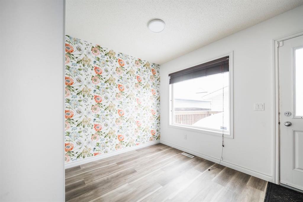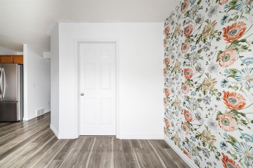 The kitchen offers warm wood cabinetry, stainless steel appliances, laminate countertops, a pantry for added storage, and a functional island for meal preparation. The dining area is accented with stylish wallpaper, creating a charming space for everyday meals and gatherings. A refreshed two piece bathroom on the main floor features a new vanity and updated flooring, and just off the living room is a bonus space that would be perfect for an office, play area, or formal dining area.