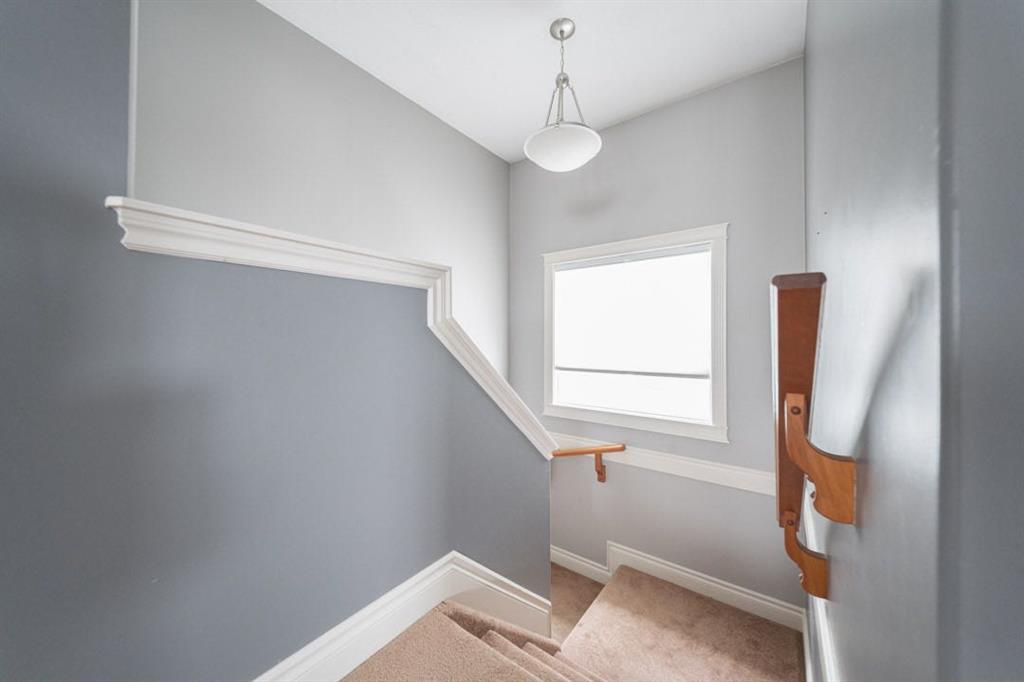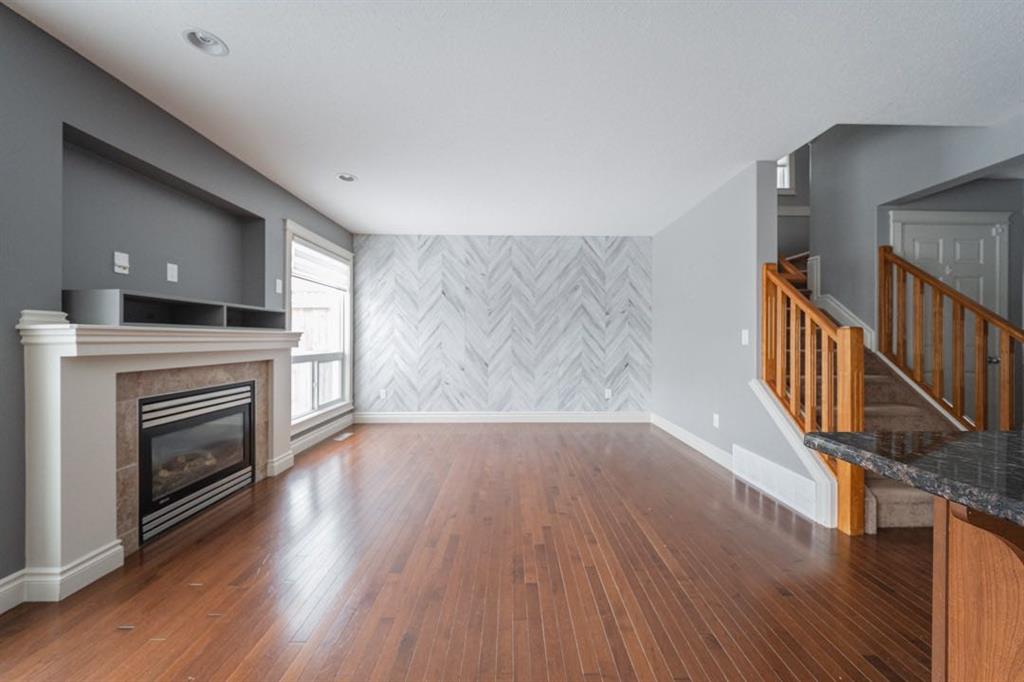 Inside, the main level features an open concept layout with a bright living room centred around a natural gas fireplace and a modern feature wall. The kitchen offers ample cabinet and counter space along with a large pantry, while the dining and living areas provide a comfortable space for everyday living and entertaining. A two piece bathroom completes this level.