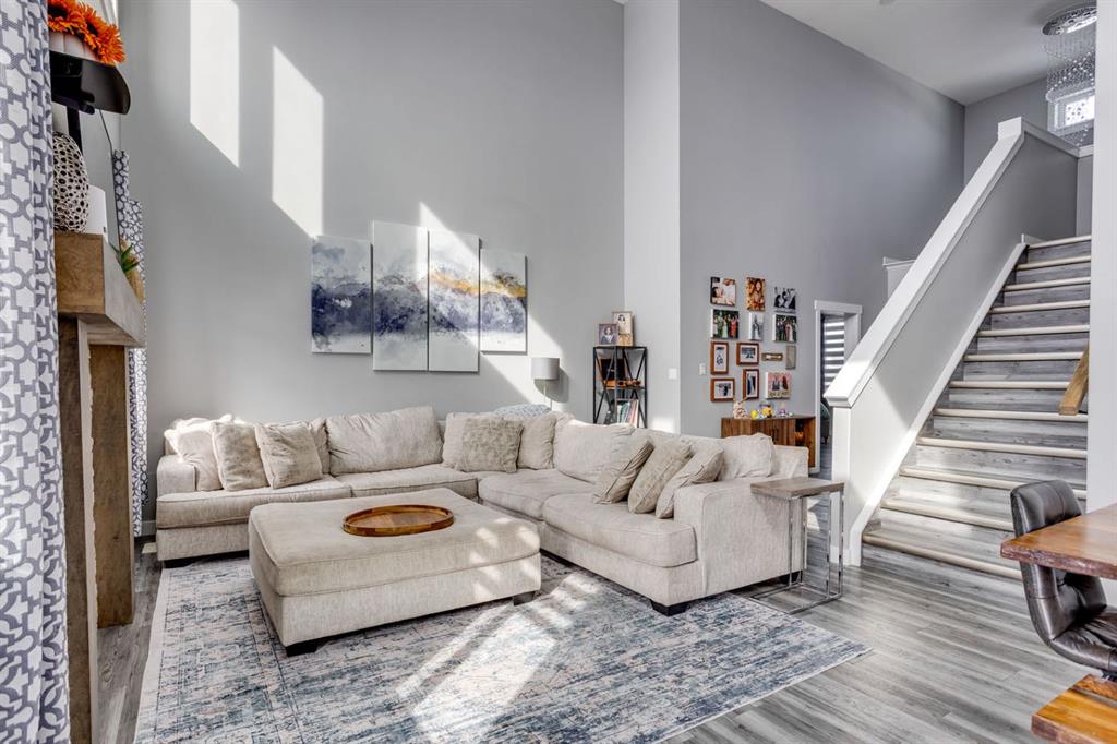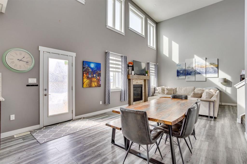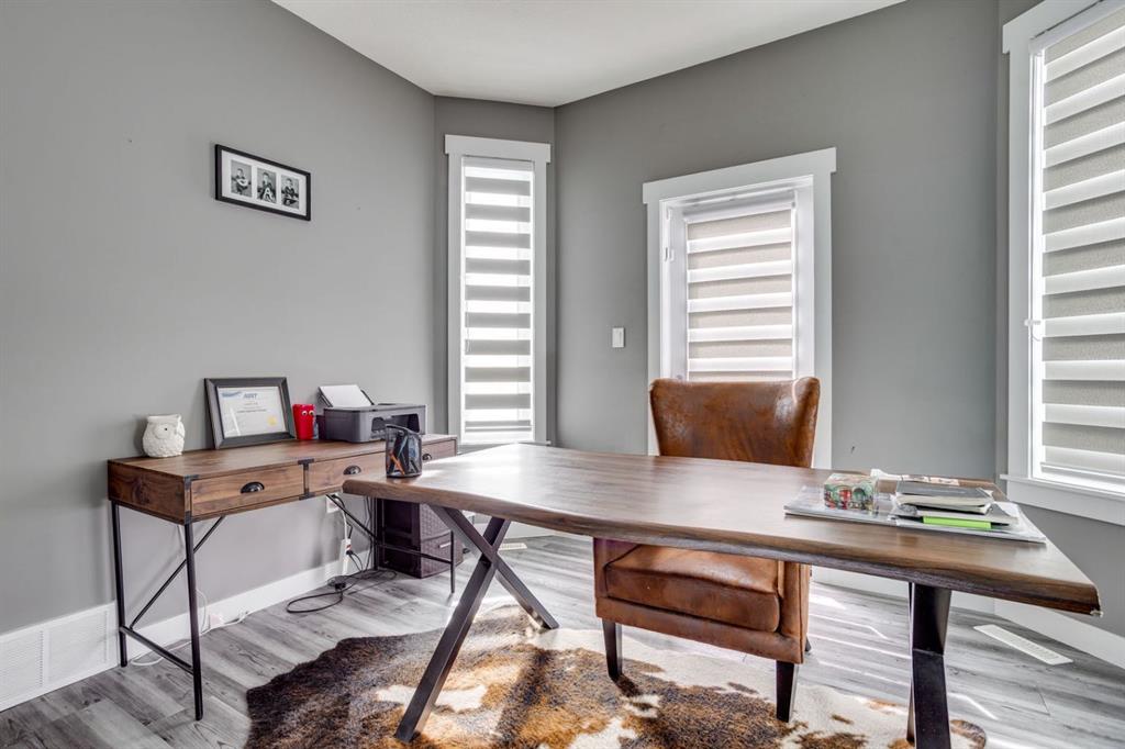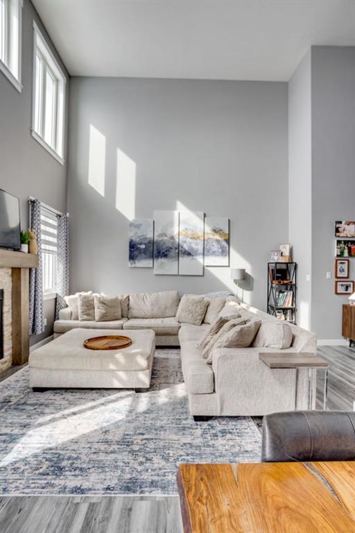 The main level features durable vinyl plank flooring, soaring ceilings, and large windows that flood the space with natural light. A spacious front entry welcomes you into the home, alongside an oversized office perfect for working from home. The living room is highlighted by impressive cathedral ceilings and a beautiful stone-surround fireplace with a wood mantel, creating a warm and inviting atmosphere.