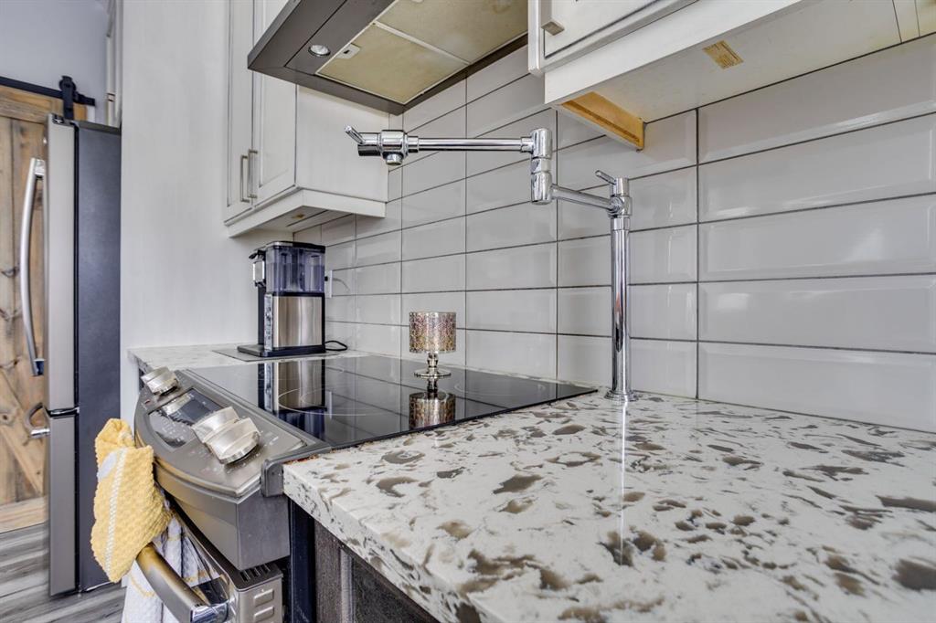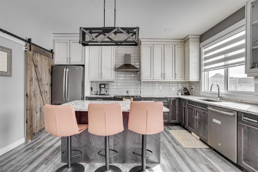 The modern kitchen is a showstopper, boasting two-tone cabinetry, a grey subway tile backsplash with pot filler, stainless steel appliances, quartz countertops, a large island, and a generous pantry complete with a rustic barn door.