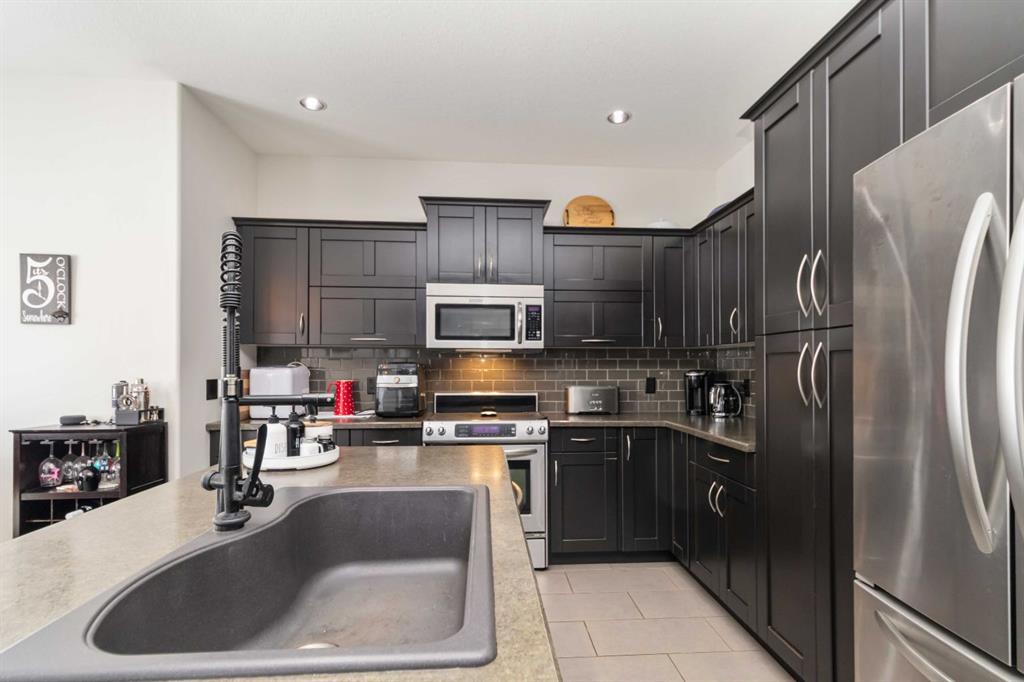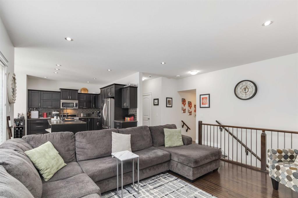 The spacious main floor includes an open concept flow ready for entertaining and family! The welcoming living room complete with a cozy gas fireplace showcases gorgeous custom built in shelving and entertainment unit. The flow from living, kitchen and dining room is the perfect package for the growing family! ( Access to the backyard off the dining room is also perfect to enjoy the sunny days with the kiddos or late night soaks in the hot tub) The kitchen is complete with warm espresso cabinetry, boasting loads of storage, countertop prep space, stainless steel appliances and eat-up kitchen island. The double granite black sink offsets this space along with updated light fixtures! There are banks of windows throughout offering an abundance of natural light too!