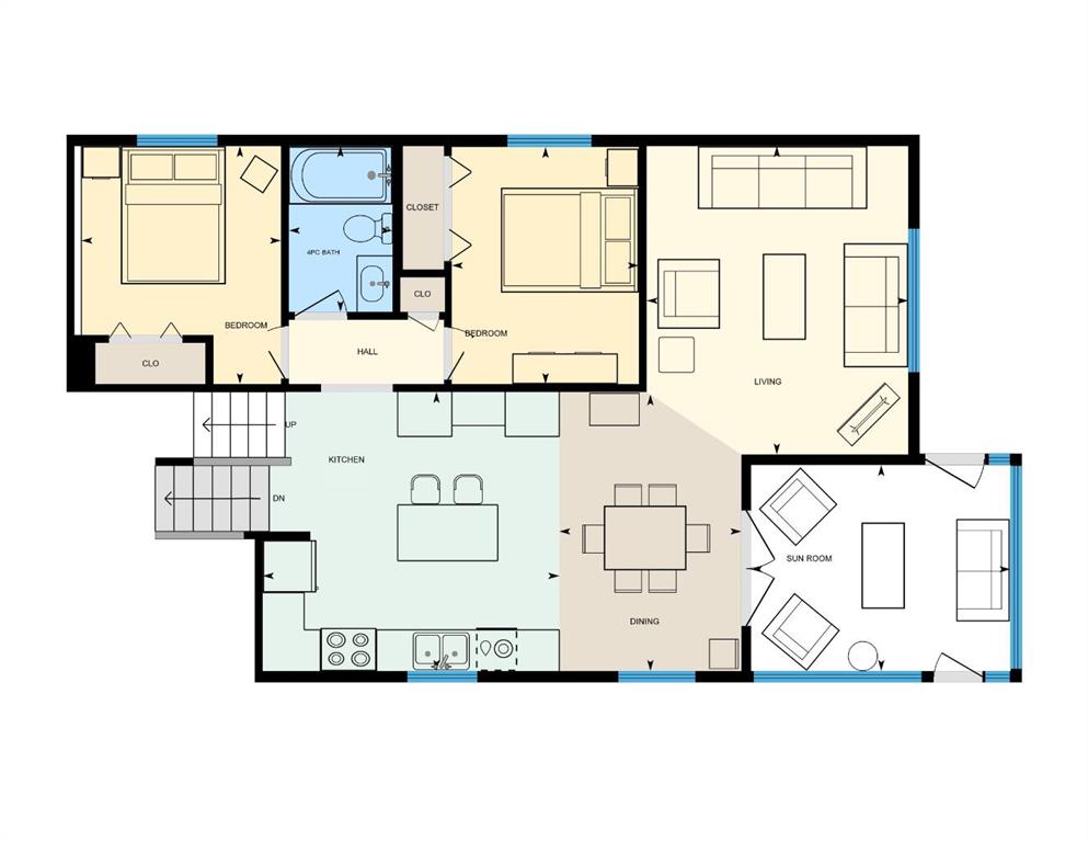 The living room is anchored by a large window that pulls in natural light, with tall ceilings that give the whole main floor an airy, open feel.