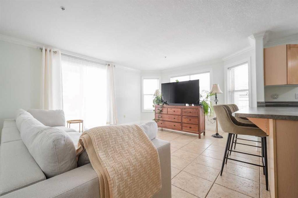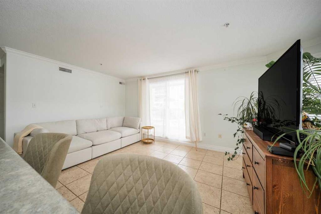 What truly sets this unit apart is the wraparound patio. Accessible from both the living room and the bedroom, it creates a generous outdoor extension of the home that is perfect for morning coffee or unwinding in the evening. Being on the ground floor also means easy access, and the conveniently located above-ground parking stall sits right beside the patio, making unloading groceries or gear quick and simple.