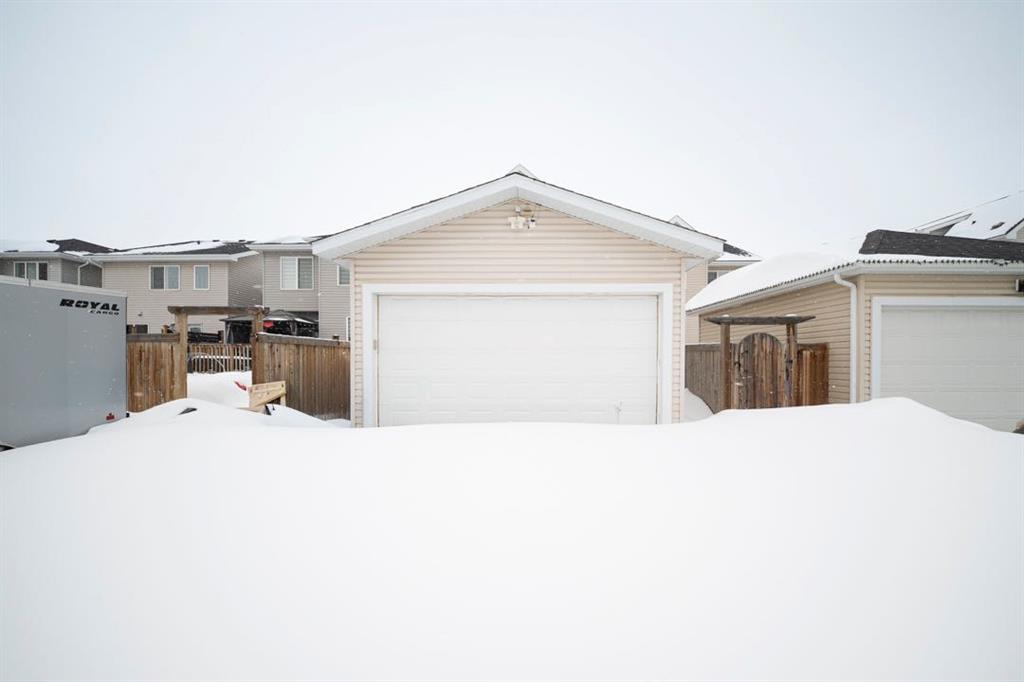 Outside, the home includes a covered front deck, a detached garage, and additional parking in front of the garage with space for up to three vehicles.