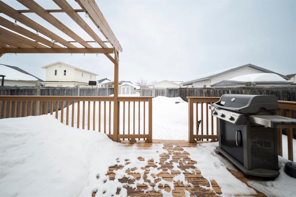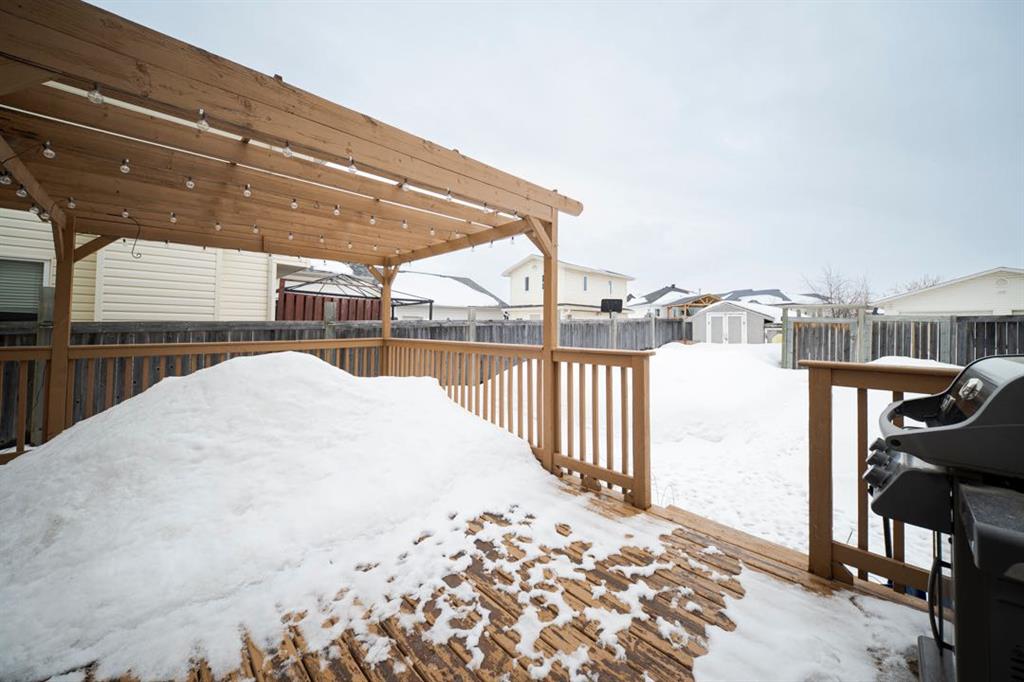 The exterior features a spacious backyard with grass landscaping, a fire pit area, and a large deck with pergola, perfect for enjoying the afternoon sun. A rear driveway provides parking for two vehicles, and a shed offers additional storage.