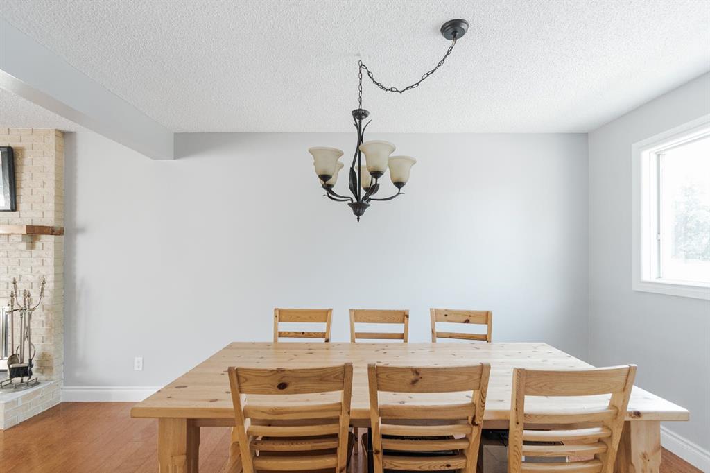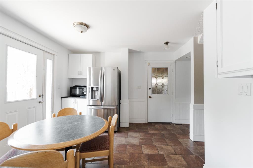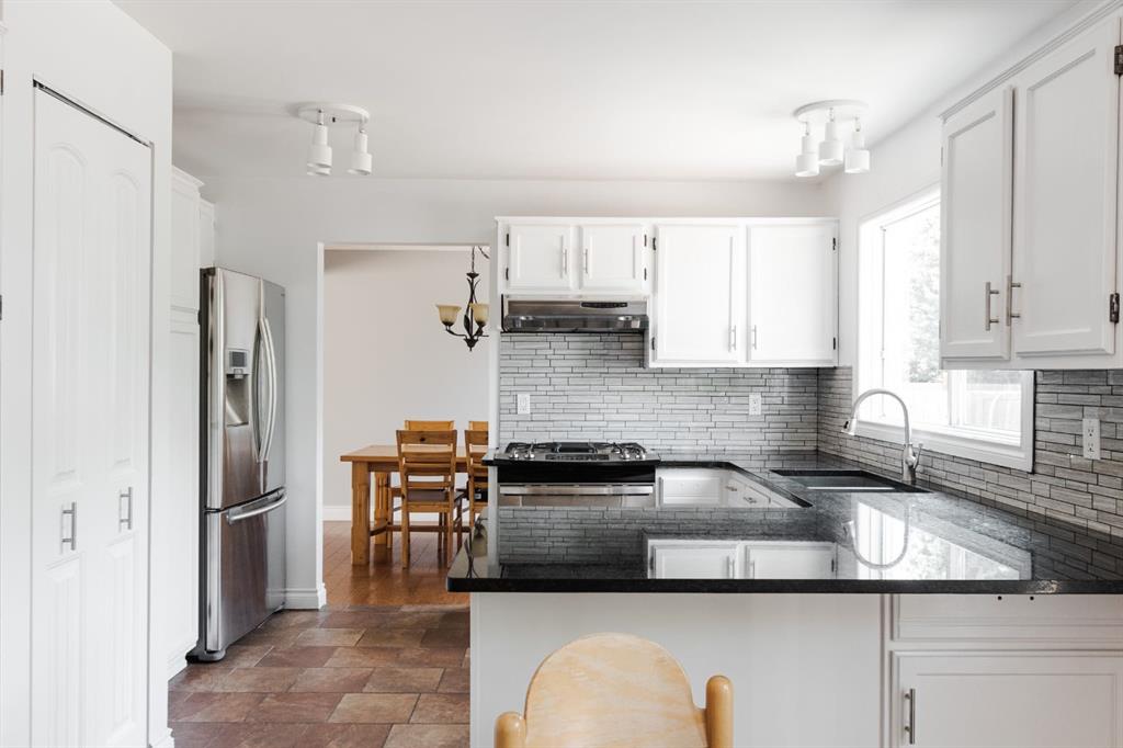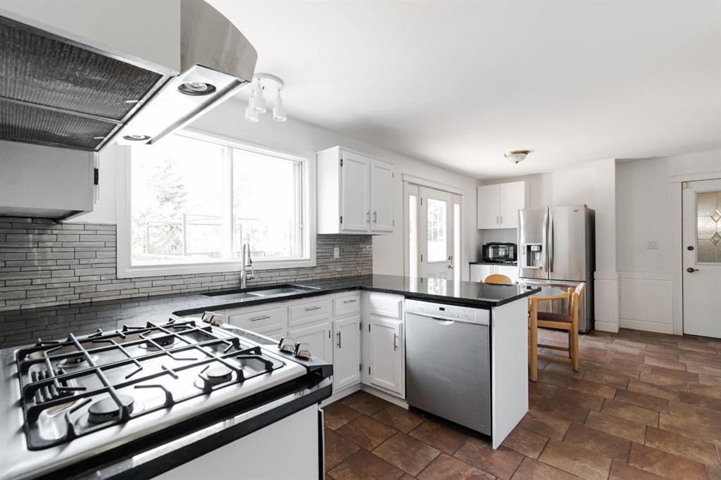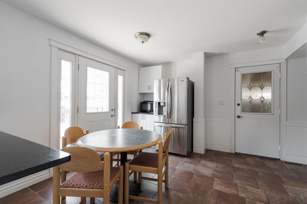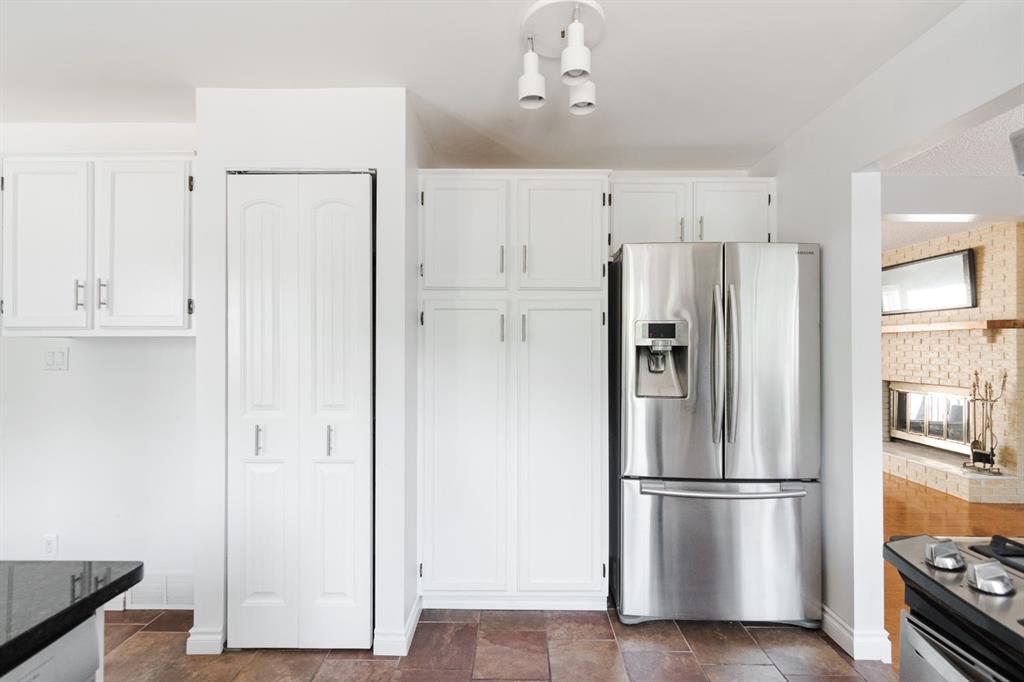 Step inside to a warm and inviting main floor layout. The front living room features large picture windows and a brick wood-burning fireplace, creating a cozy gathering space. The adjacent dining room offers room for formal entertaining and connects seamlessly to the bright kitchen at the back of the home. Here, refinished white cabinetry, black granite countertops, and stainless steel appliances including a gas range elevate the space, while a coffee bar with a second fridge adds everyday convenience. Garden doors lead out to the rear deck, making indoor-outdoor living effortless. A two piece powder room and access to the enclosed hot tub area complete the main level.
