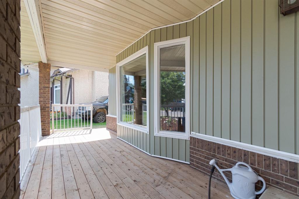 The exterior exudes timeless charm with green painted siding paired with classic brick, manicured garden beds, updated shingles, and a covered front porch that sets a welcoming tone. The oversized lot widens at the rear, giving you a fully fenced, west-facing backyard bathed in sunshine throughout the day—complete with a large deck ideal for entertaining or envisioning your future backyard pool.