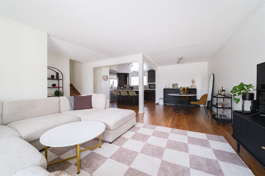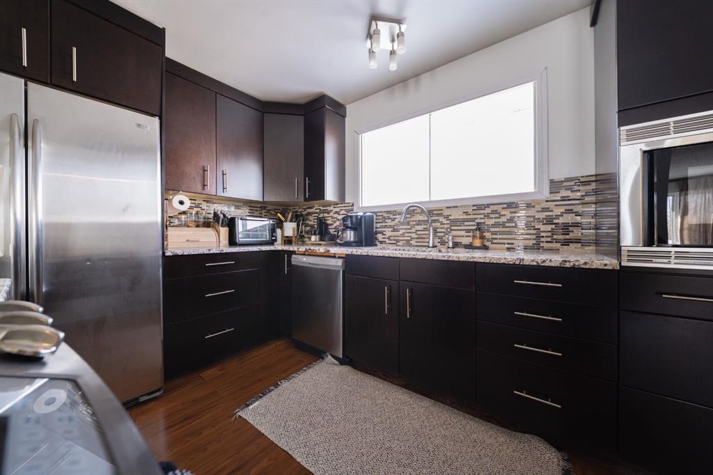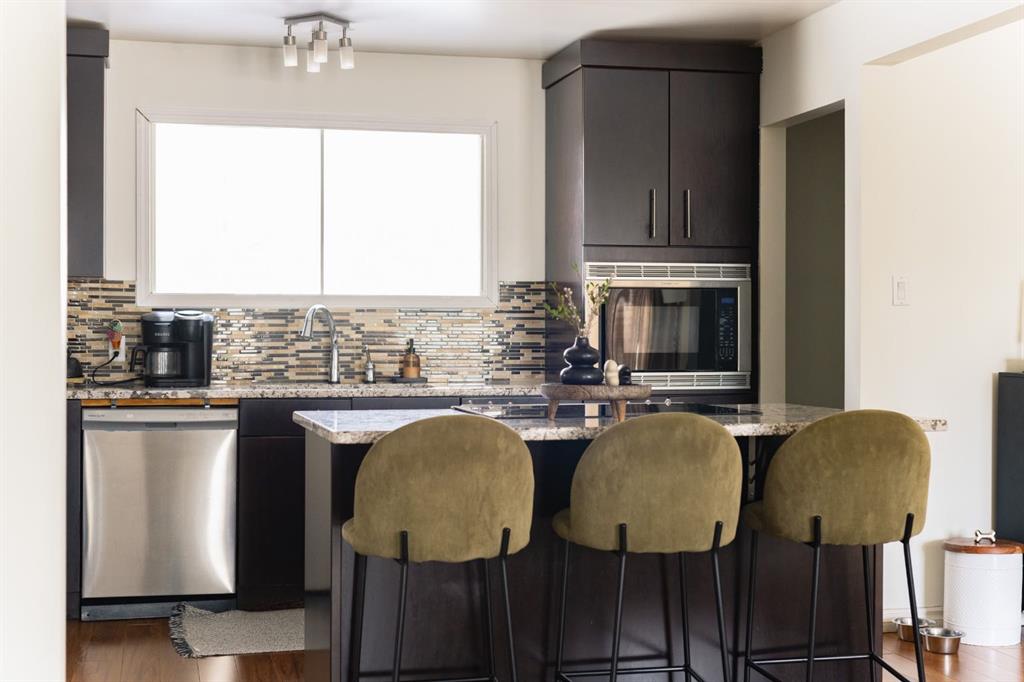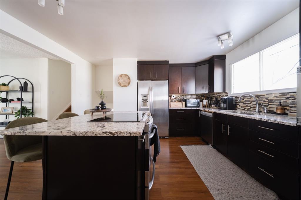 An open floor plan welcomes you inside where an updated kitchen with rich coloured cabinets, beautiful granite countertops, a large island, stainless steel appliances and a mosaic tile backsplash. Large windows bring in natural light and views and make the living room and dining room bright.