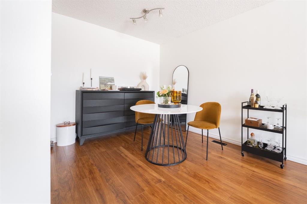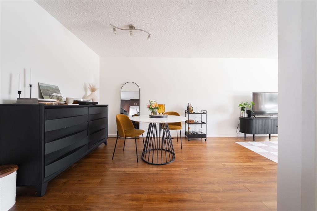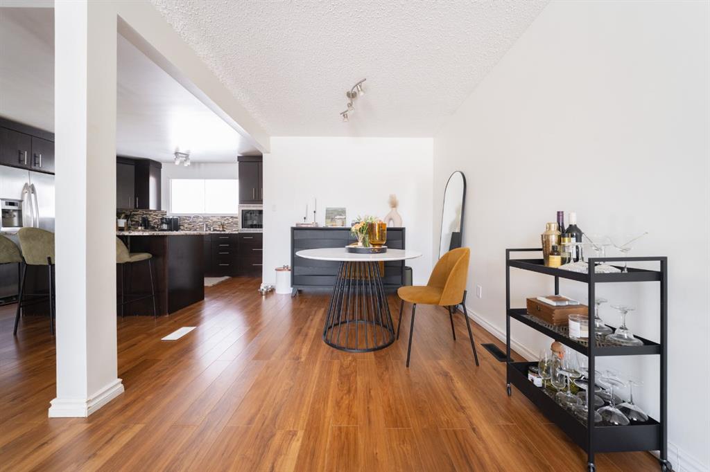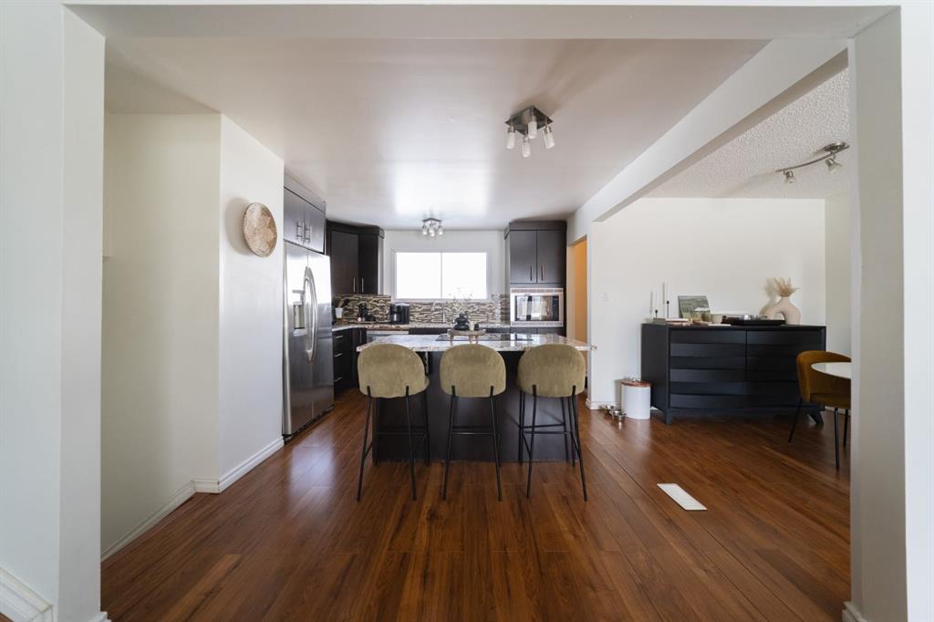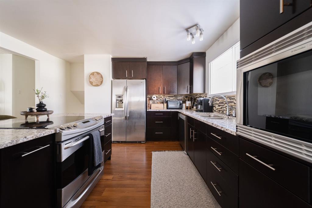 An open floor plan welcomes you inside where an updated kitchen with rich coloured cabinets, beautiful granite countertops, a large island, stainless steel appliances and a mosaic tile backsplash. Large windows bring in natural light and views and make the living room and dining room bright.