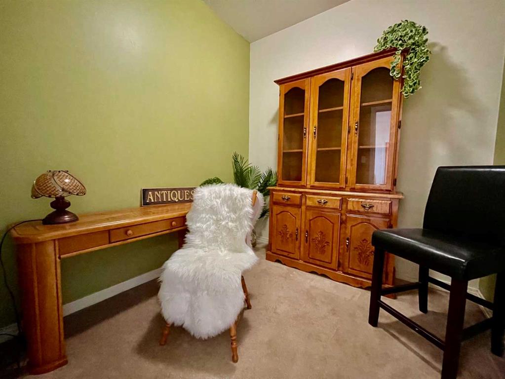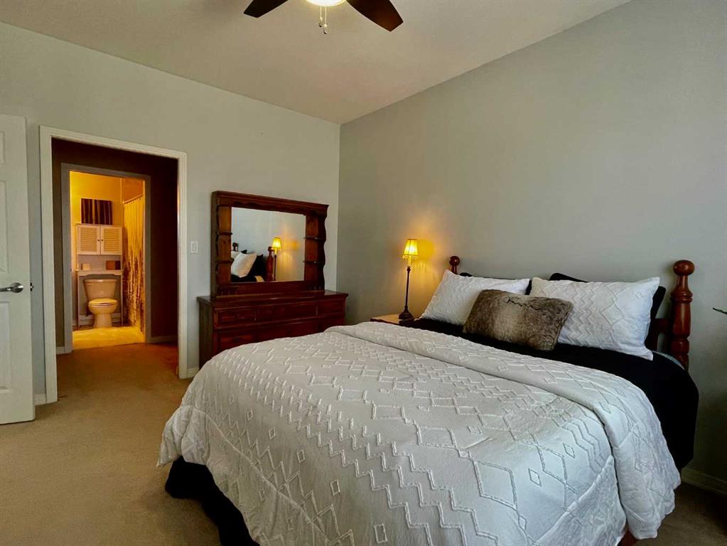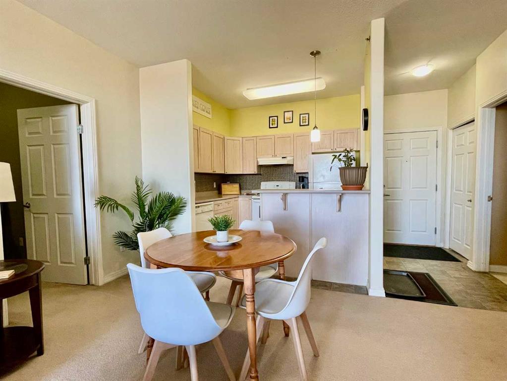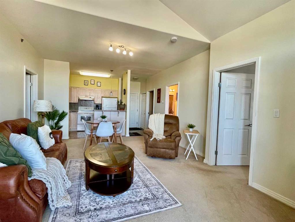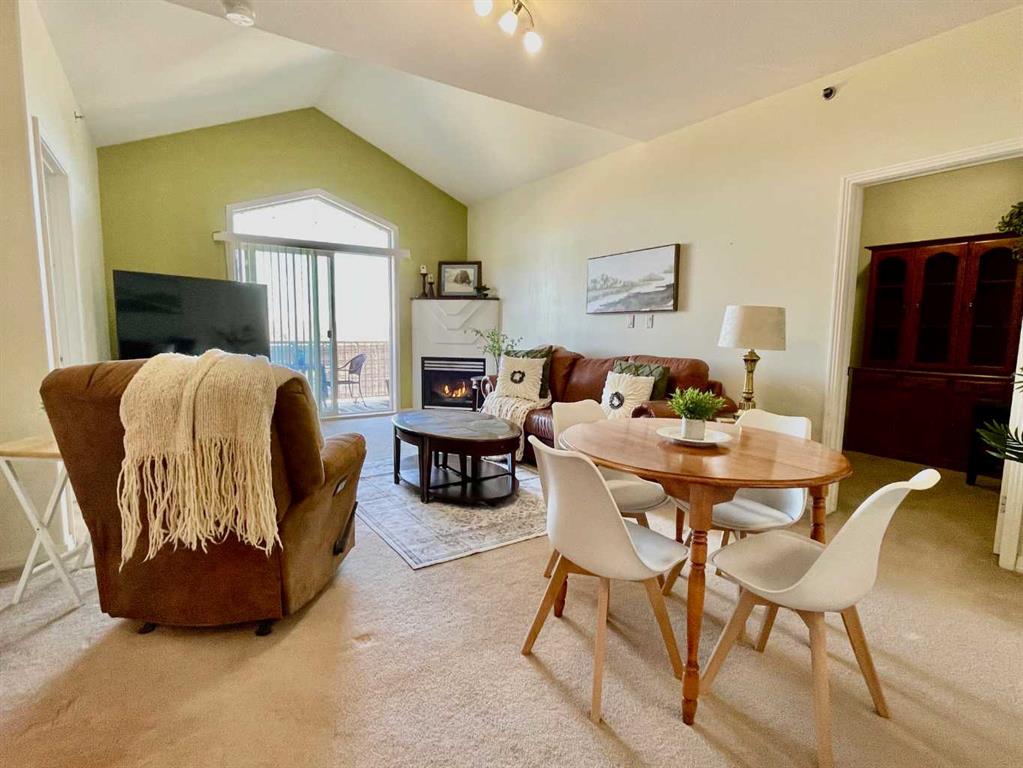 Top-floor living with beautiful views! This bright and inviting 1-bedroom plus den condo at 303-1095 Timberline is move-in ready and available for immediate possession. The open layout features vaulted ceilings, a gas fireplace, an eat-up breakfast bar, in-floor heating, and convenient in-suite laundry. The primary bedroom includes a walk-in closet, and the main bathroom offers a deep soaker tub for unwinding at the end of the day.