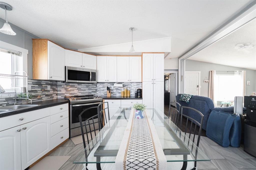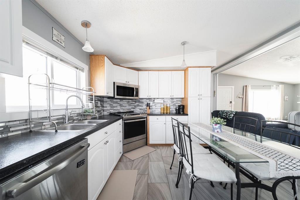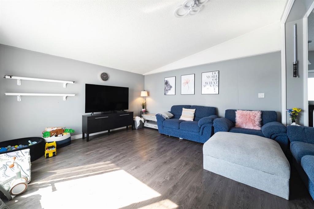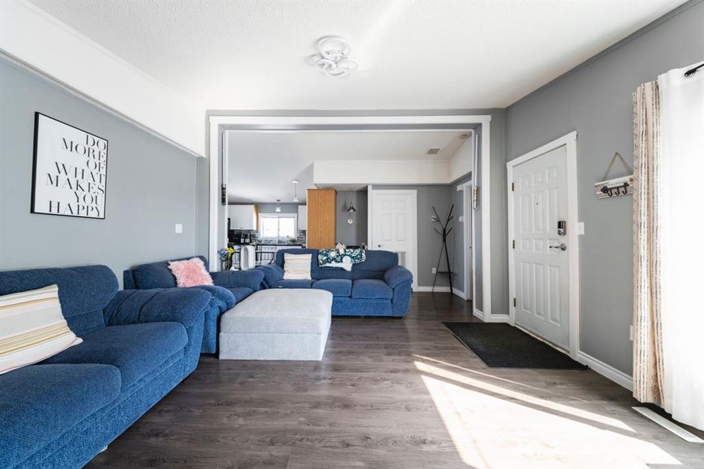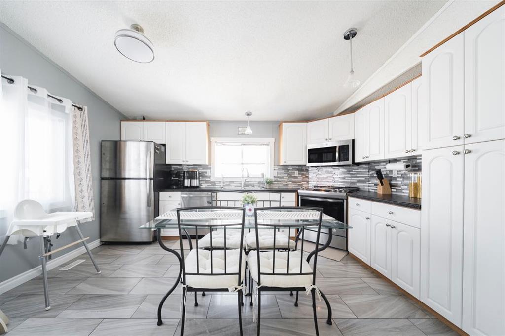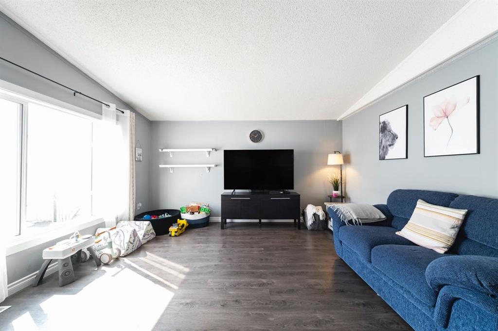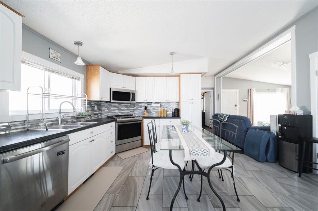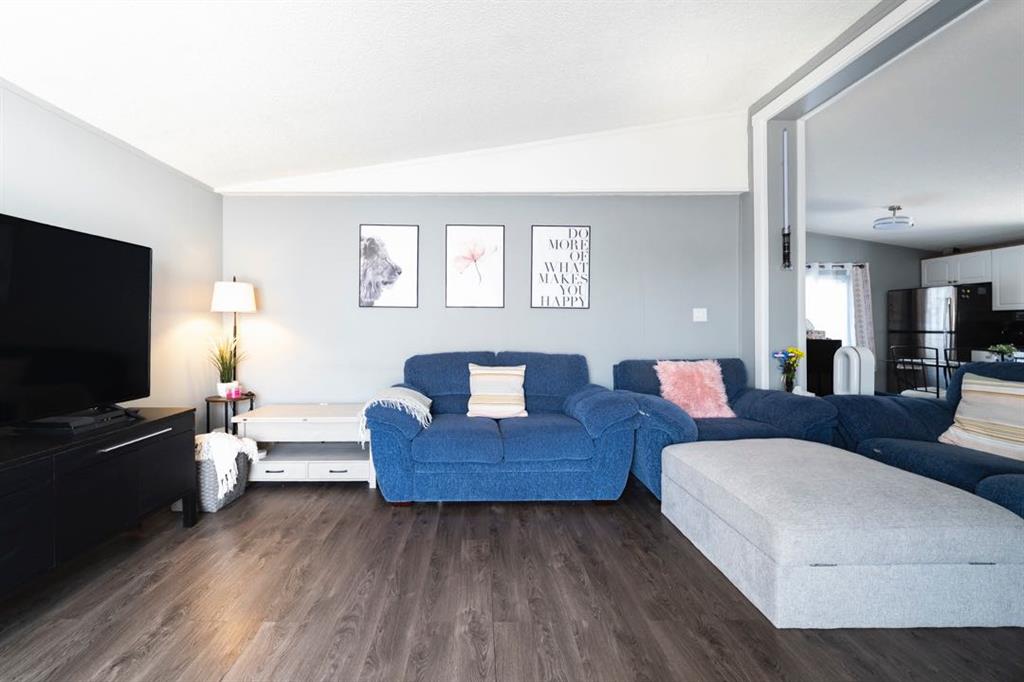 The front deck welcomes you inside where vaulted ceilings, LED lighting, and neutral grey walls create a bright and open atmosphere throughout. The open concept main living area features laminate flooring in the living room that flows into a well appointed kitchen with tile flooring, white cabinetry, stainless steel appliances, and a dining area, making the space ideal for both daily routines and casual entertaining. No carpet anywhere in the home means easy maintenance from top to bottom.