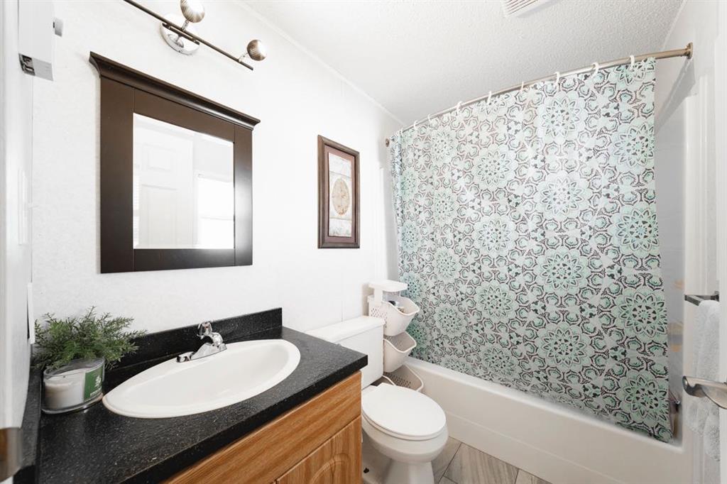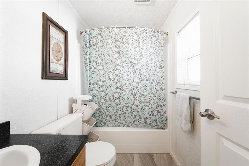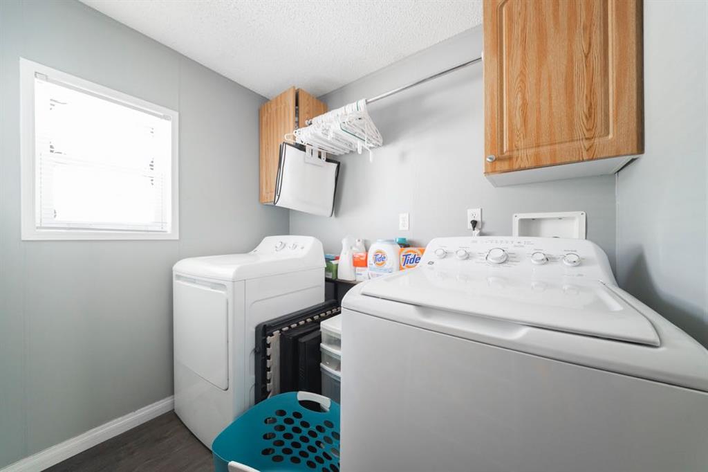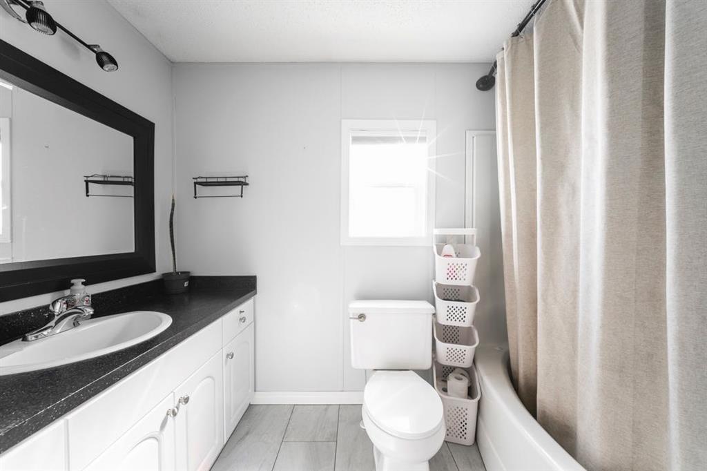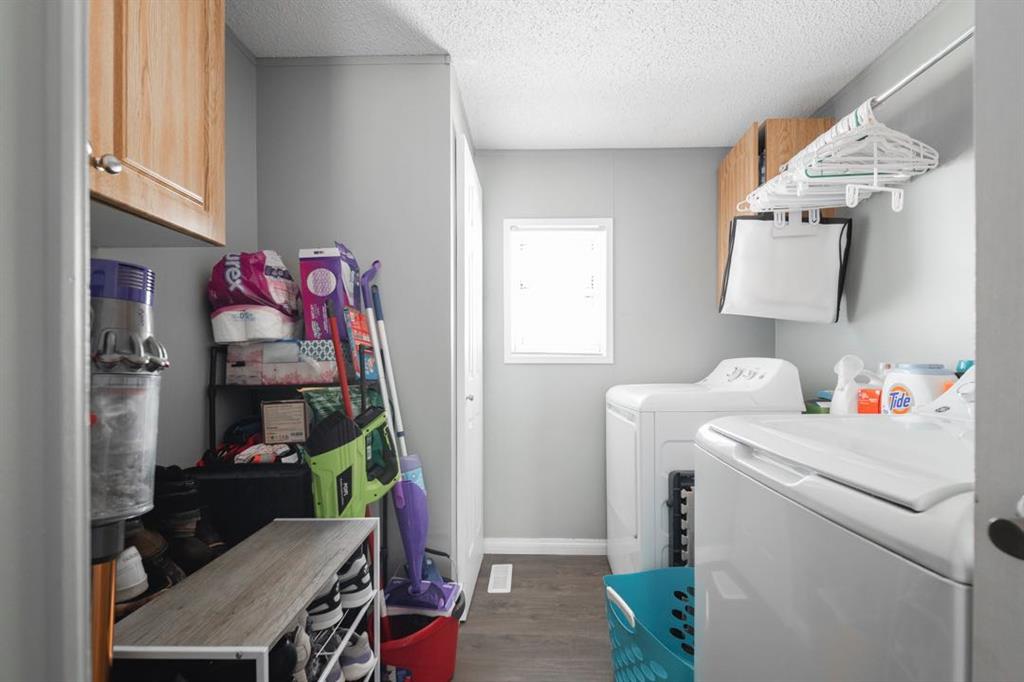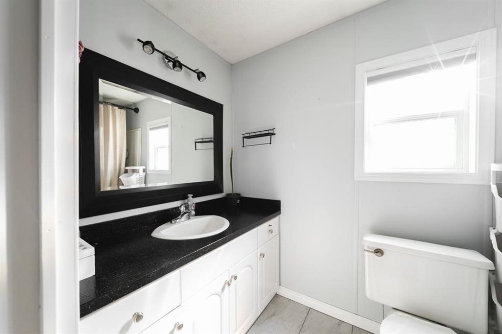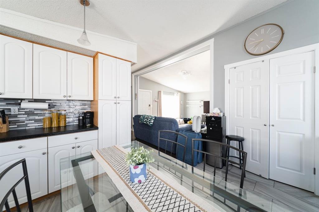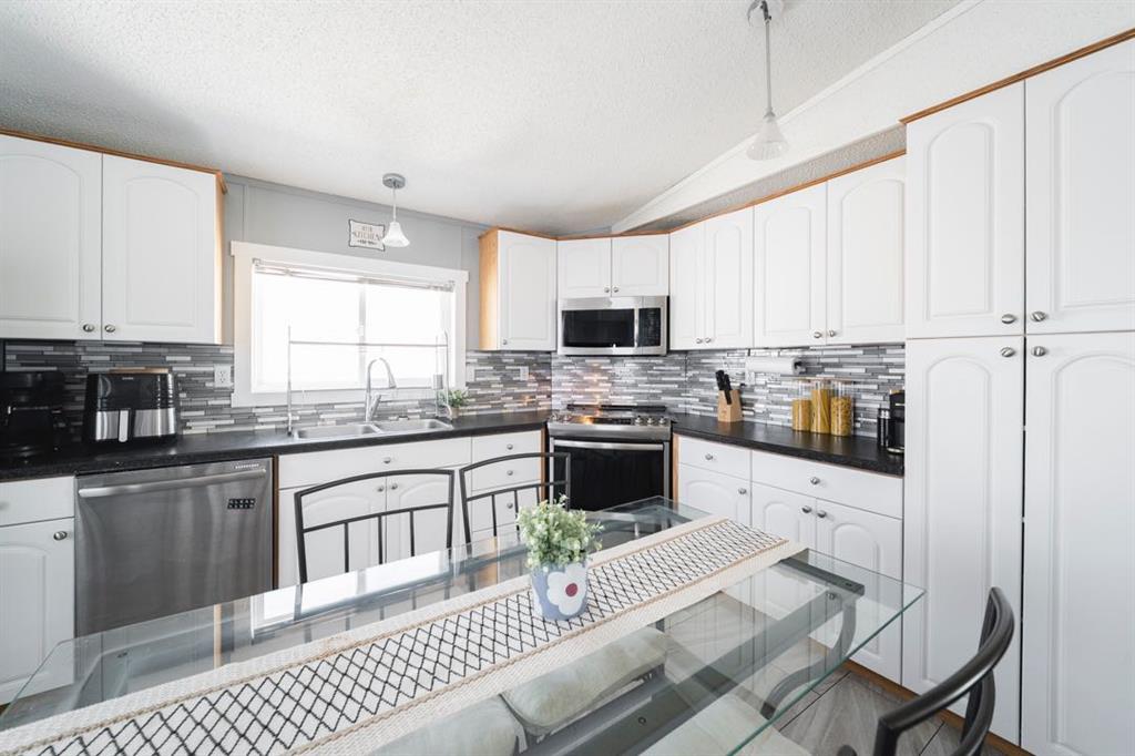 The front deck welcomes you inside where vaulted ceilings, LED lighting, and neutral grey walls create a bright and open atmosphere throughout. The open concept main living area features laminate flooring in the living room that flows into a well appointed kitchen with tile flooring, white cabinetry, stainless steel appliances, and a dining area, making the space ideal for both daily routines and casual entertaining. No carpet anywhere in the home means easy maintenance from top to bottom.