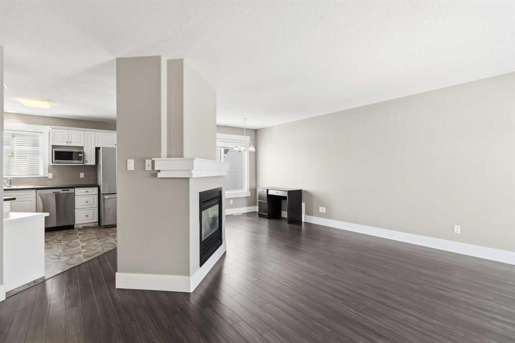 This bright corner unit stands out with extra windows that fill the home with natural light and enhance the spacious feel throughout. The main floor features an open-concept design centered around a cozy gas fireplace, creating a warm and inviting living space. The kitchen is both stylish and practical, showcasing stainless steel appliances, ample cabinetry, and plenty of counter space, seamlessly connecting to the dining area.