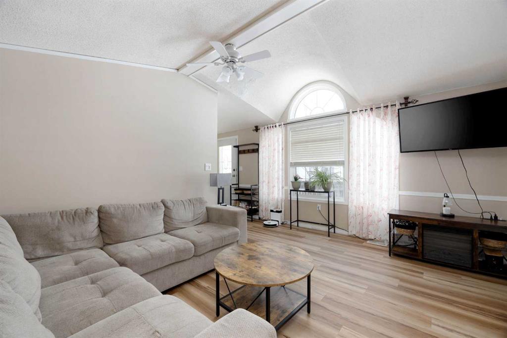 Inside, vaulted ceilings open the place up the second you walk in. The kitchen is already done: white cabinets, subway tile backsplash, butcher block counters, and a full stainless package including dishwasher. The arched window in the front living room is a real moment, and the reclaimed wood feature wall in the back gives the home character you don't see at this price.