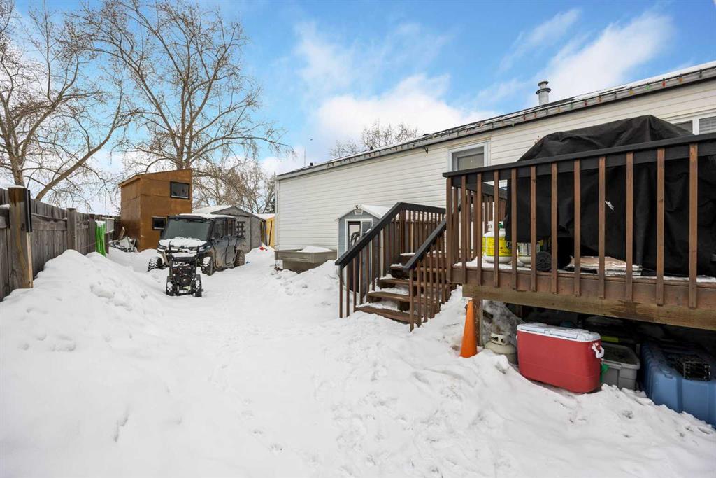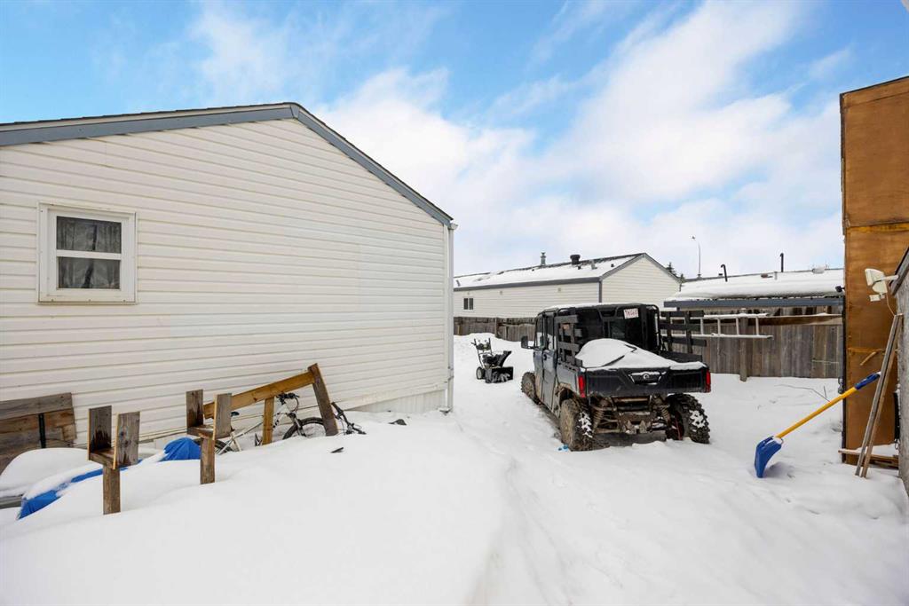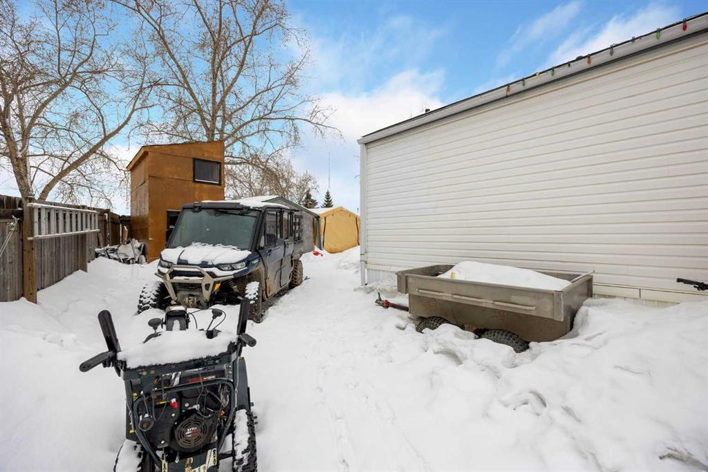 Corner position, backing onto open green space, with the alleyway path running along the side. No neighbour crammed in beside you. The side yard fits the truck, the side-by-side, the snowmobile trailer, and the boat rack with room to spare. If you've got toys, this is where they live.