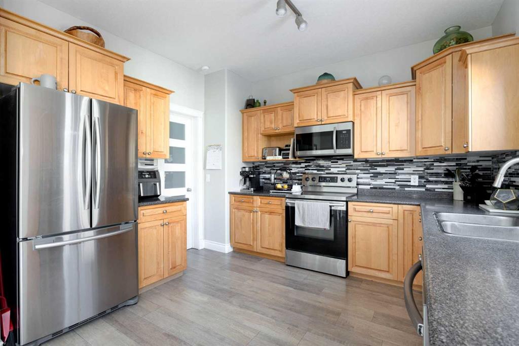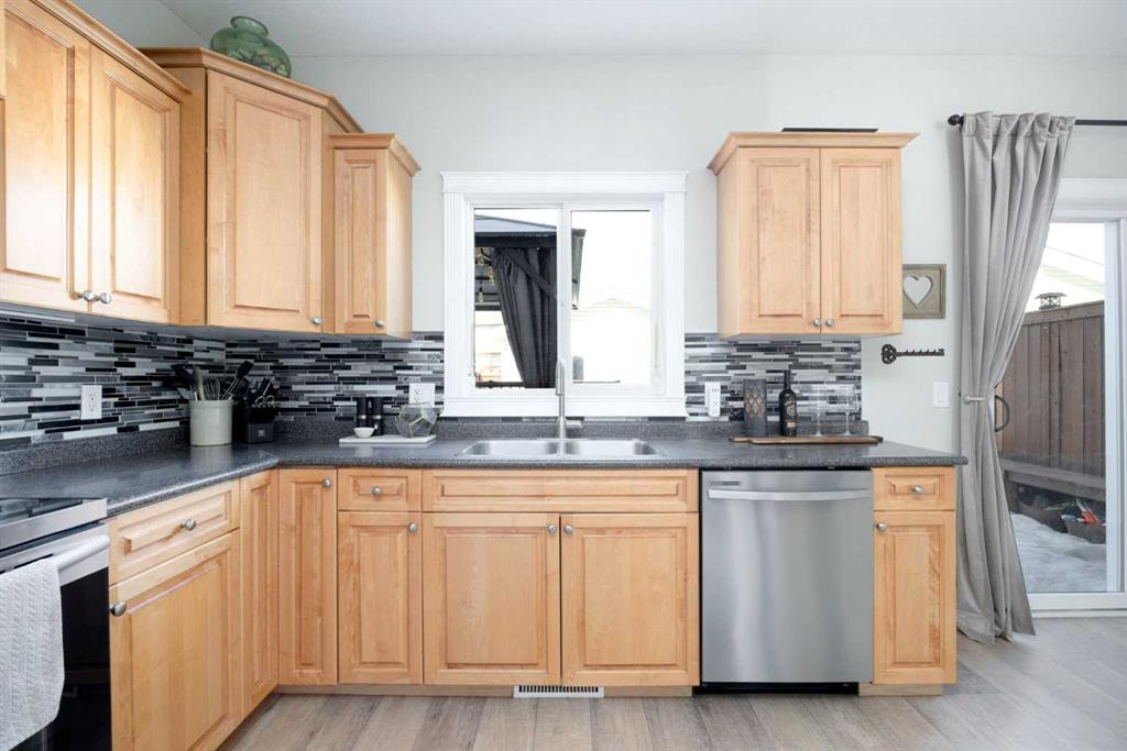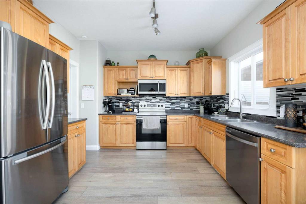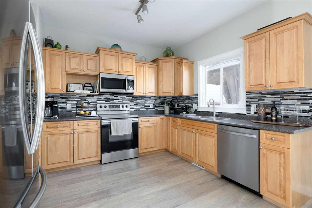 The kitchen is functional, warm, and ready for real life with maple cabinetry, tile backsplash, and a full lineup of updated appliances including fridge and stove (2023), dishwasher (2025), washer and dryer (2025), and microwave (2026).
