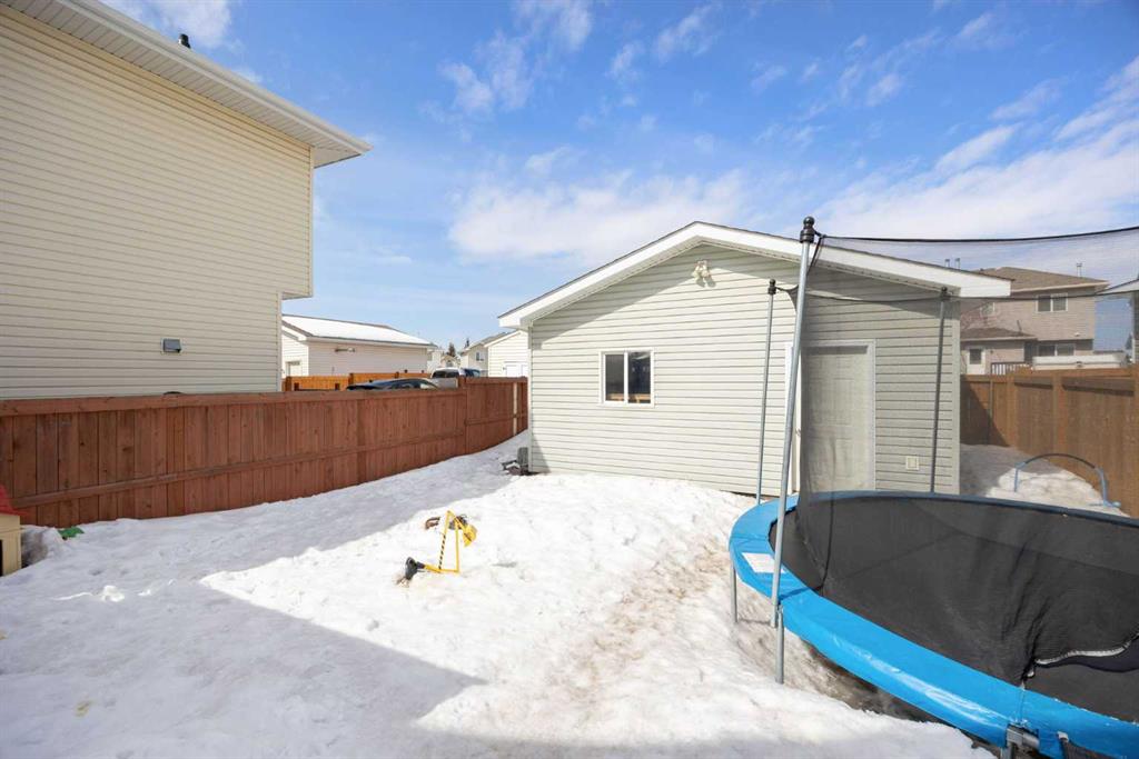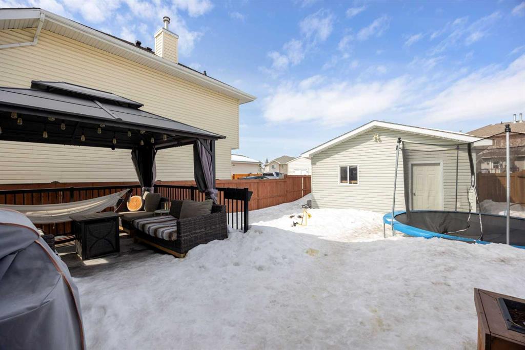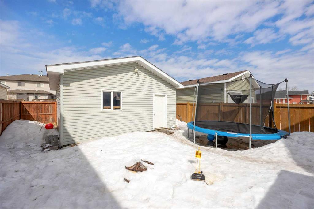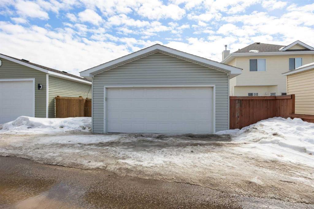 Out back, the yard is a great size and absolutely passes the trampoline test, with a wood bench and privacy wall (2025) on the deck creating a cozy outdoor hangout space. The double detached garage offers plenty of room, plus the rare bonus of having space to park a full-size truck sideways in front of the garage for additional parking.