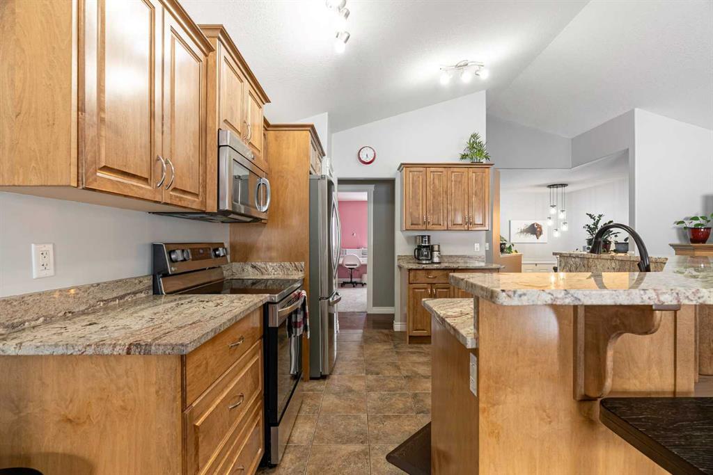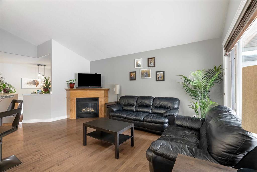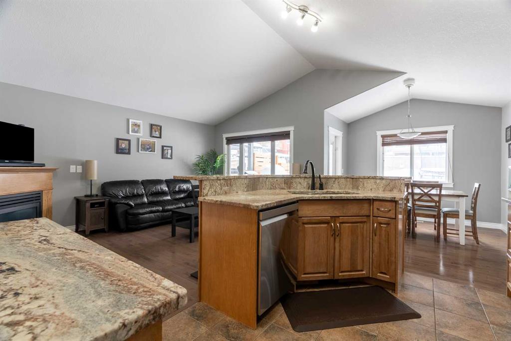 The main floor features vaulted ceilings, hardwood flooring, and large windows that fill the home with natural light. The kitchen offers stone countertops, stainless steel appliances, and a raised eating bar, opening nicely to the dining area and living room with a cozy gas fireplace.