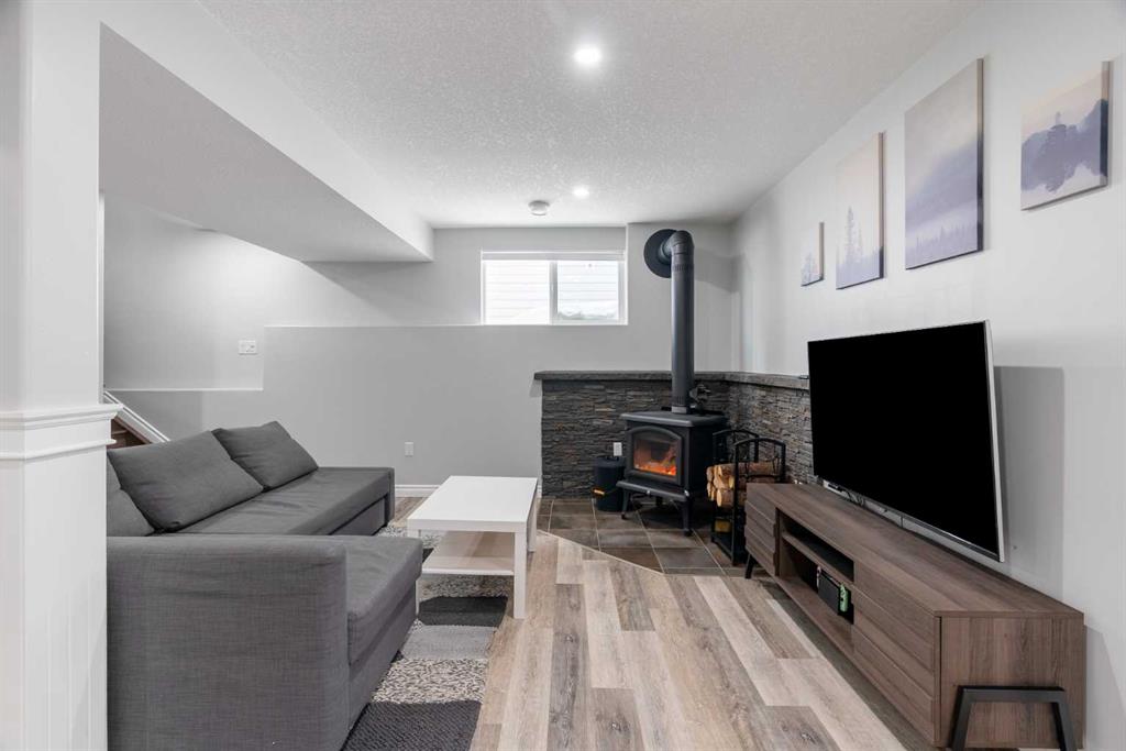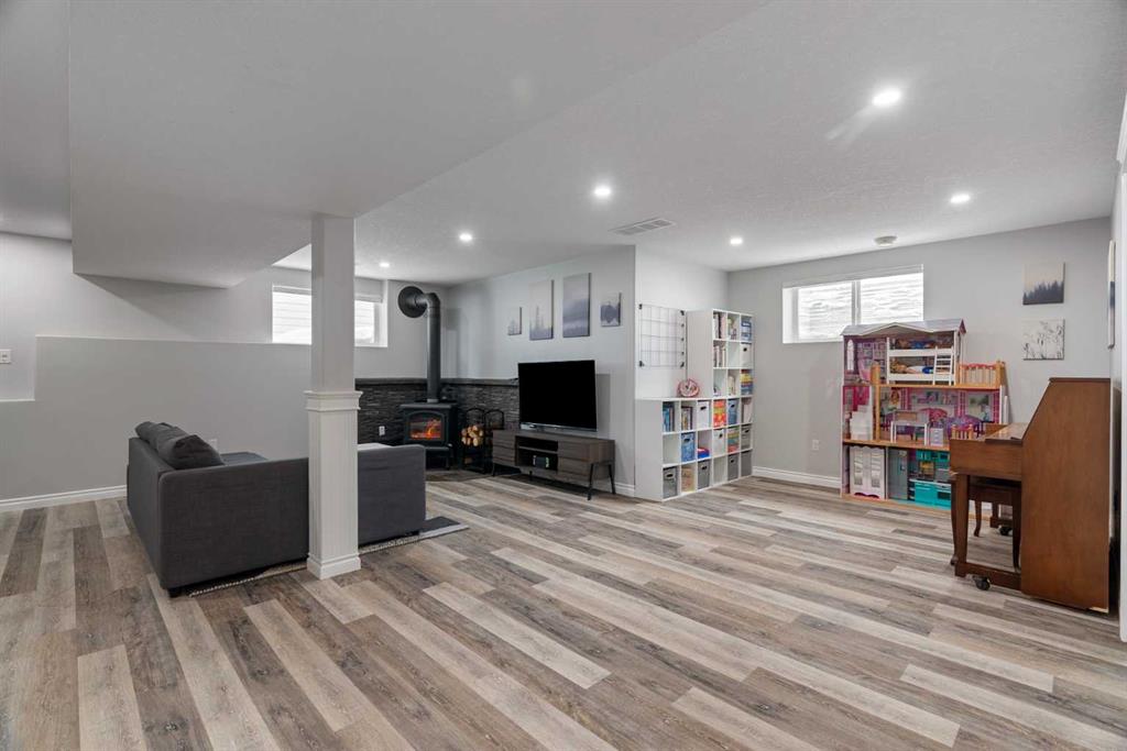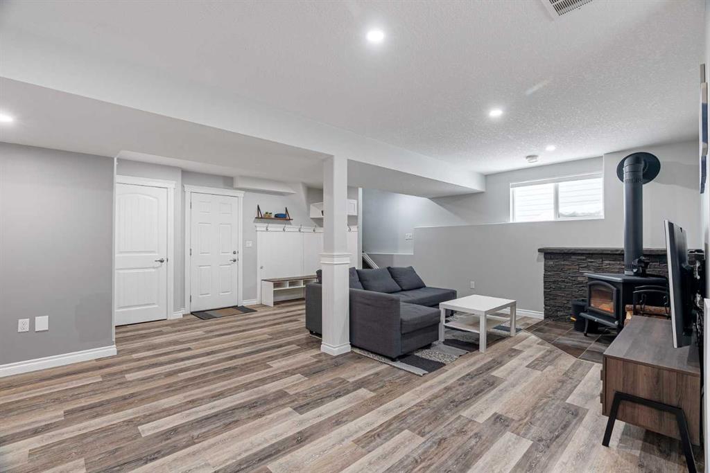 The fully finished basement is set up as a warm and inviting family space featuring a beautiful wood-burning fireplace with stone surround, plus a custom mudroom-style storage area with built-in seating and hooks perfect for keeping busy households organized.